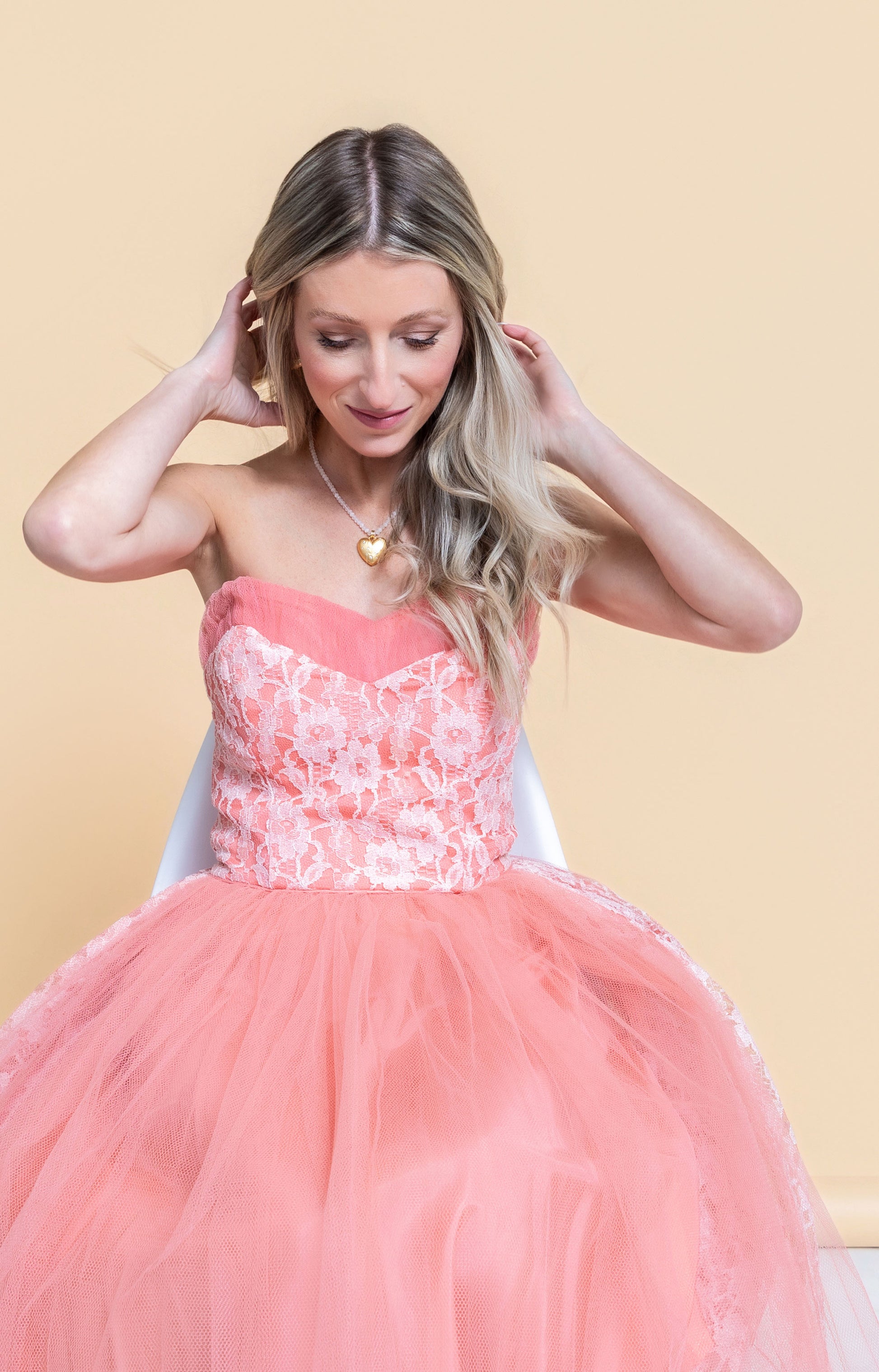 The Kaitlyn Necklace features a delicate moonstone strand complemented by a shimmering gold heart pendant for a subtle yet elegant look.