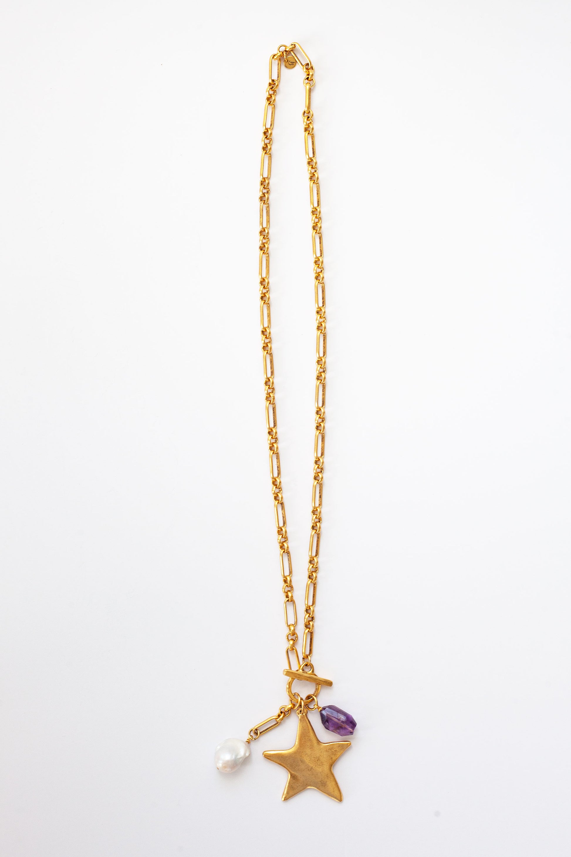 The Lizzie Necklace showcases a long alternating chain accentuated by an oversized star pendant, and freshwater pearl and amethyst charms..