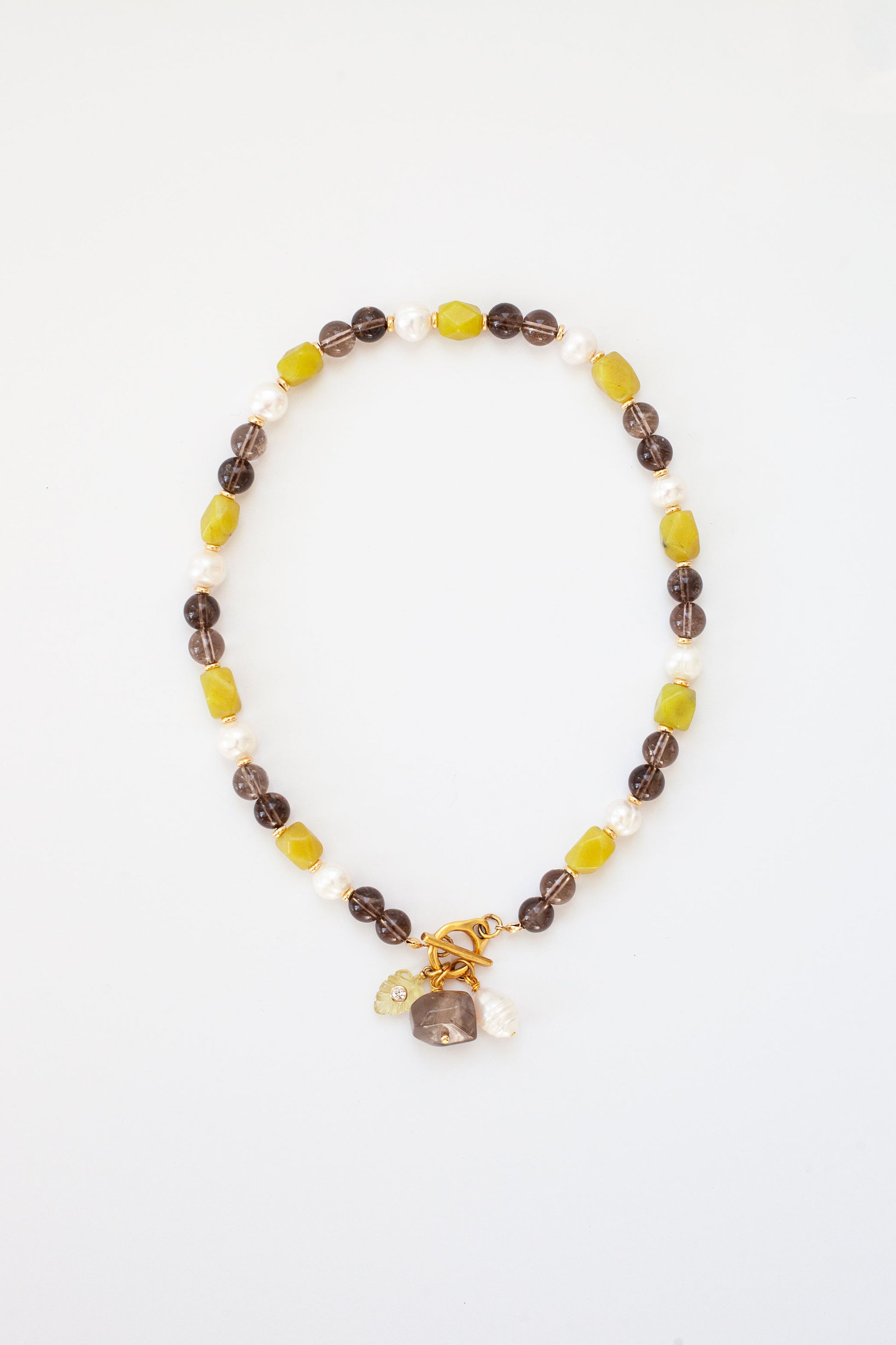 The Nina Necklace combines smokey quartz, pearls, and chartreuse accents in a collar strand featuring delicate dangle pendants, making it an ideal accessory to elevate your Fall wardrobe with refined elegance.