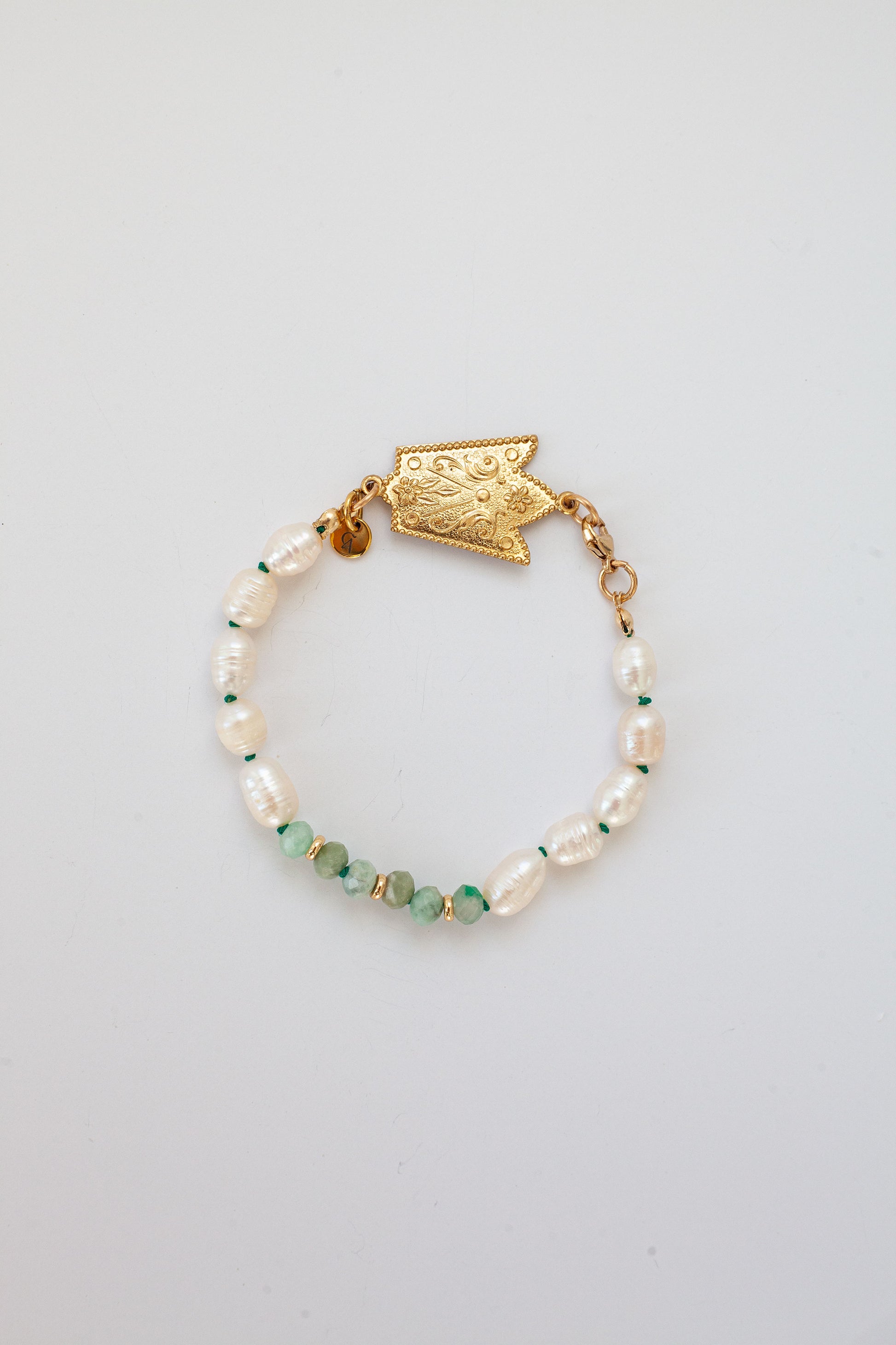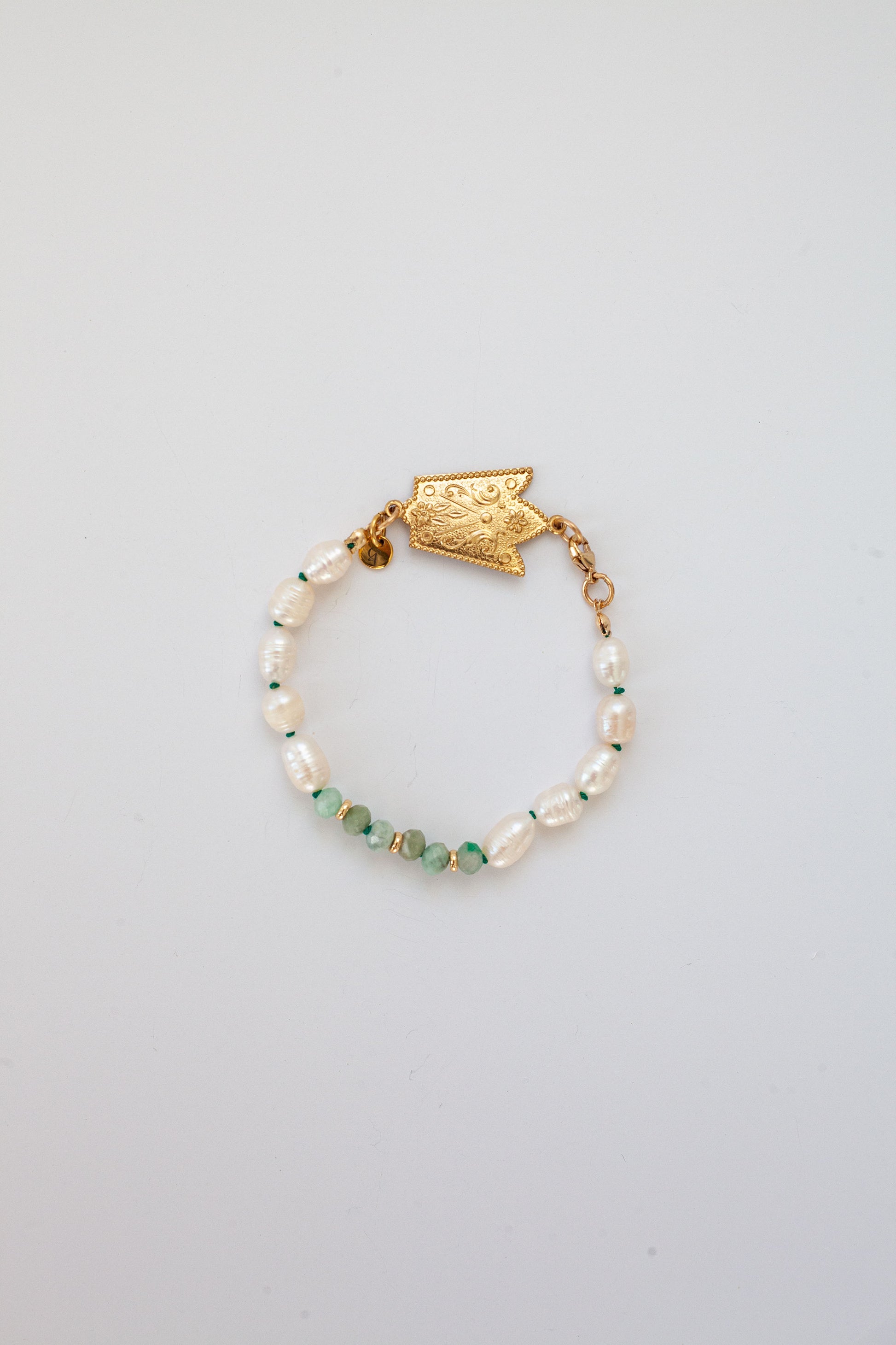 The Raya Bracelet in Green features freshwater pearls hand-knotted on silk, accented with gemstones and a vintage brass connector for an elegant, timeless design.