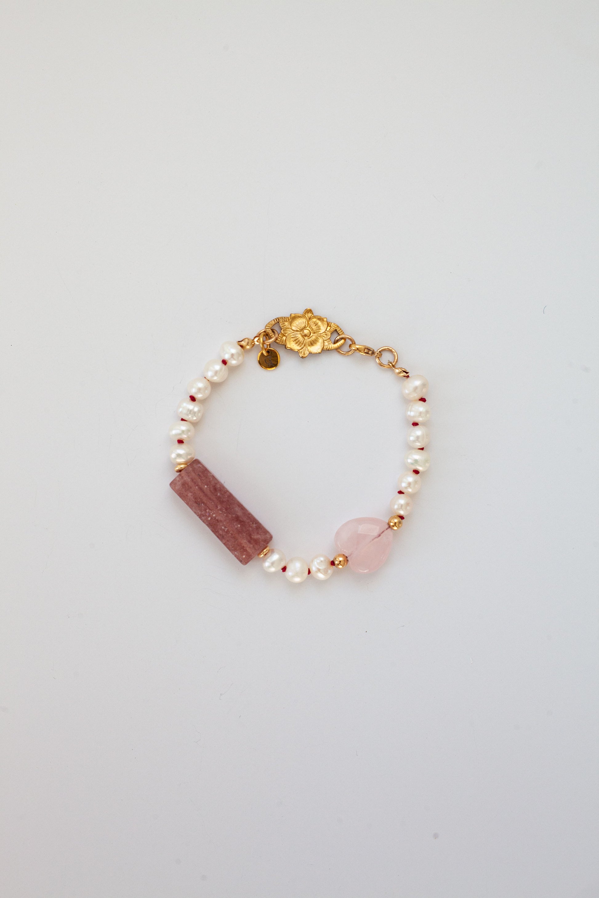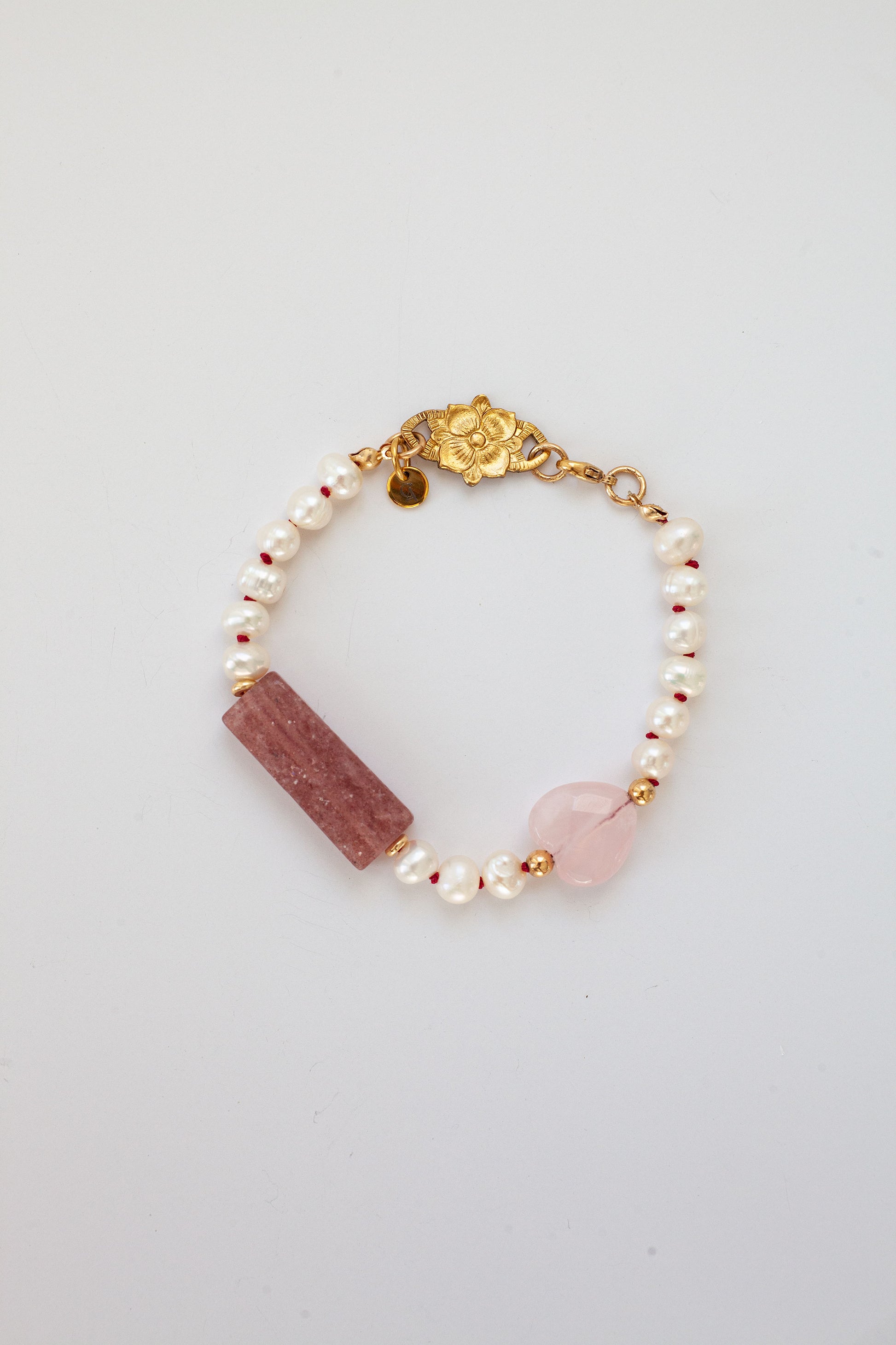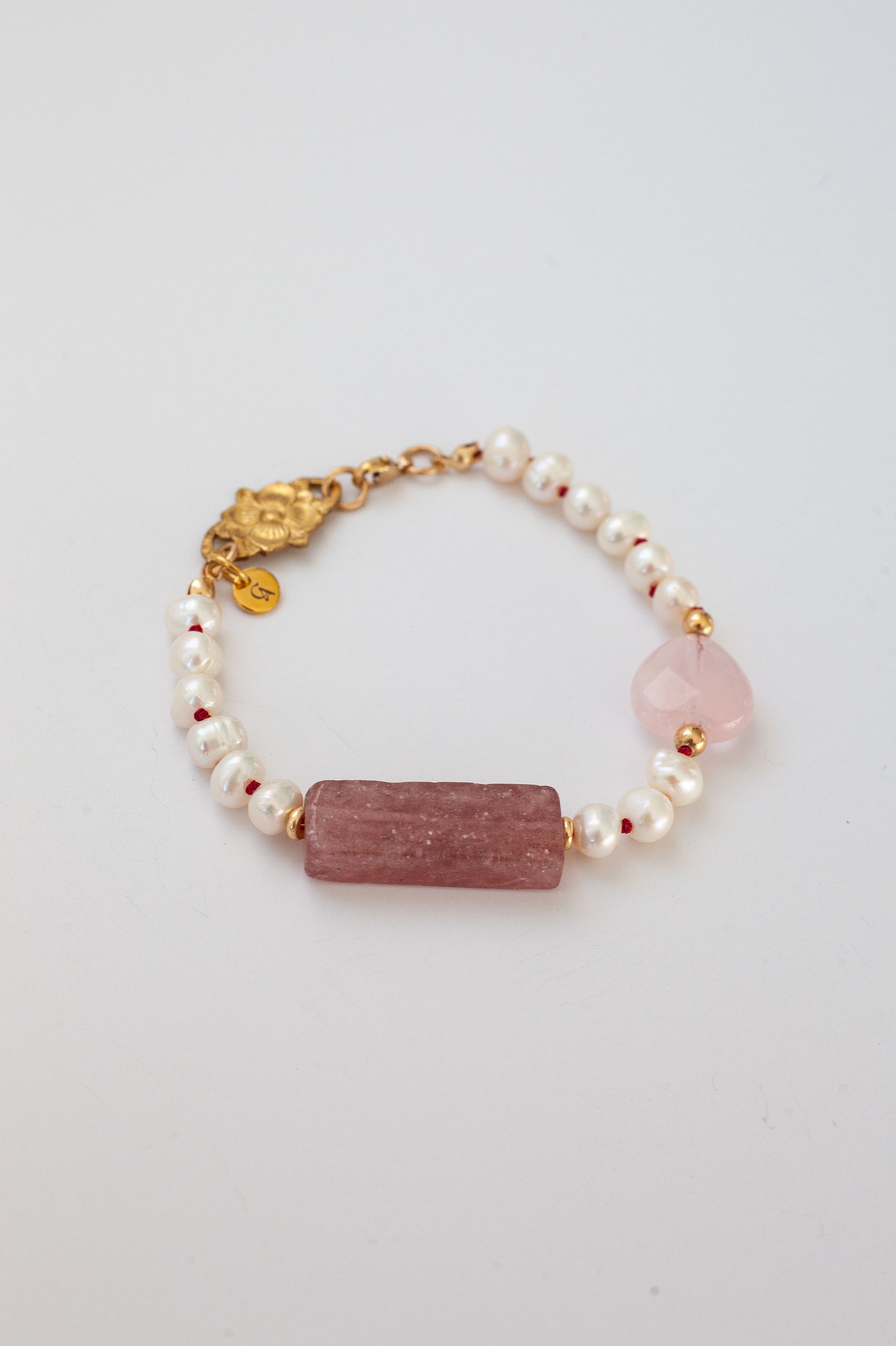 The Raya Bracelet in Pink is a stunning bracelet featuring freshwater pearls hand-knotted on silk, complemented by gemstones and finished with a vintage brass connector for a classic and elegant look.