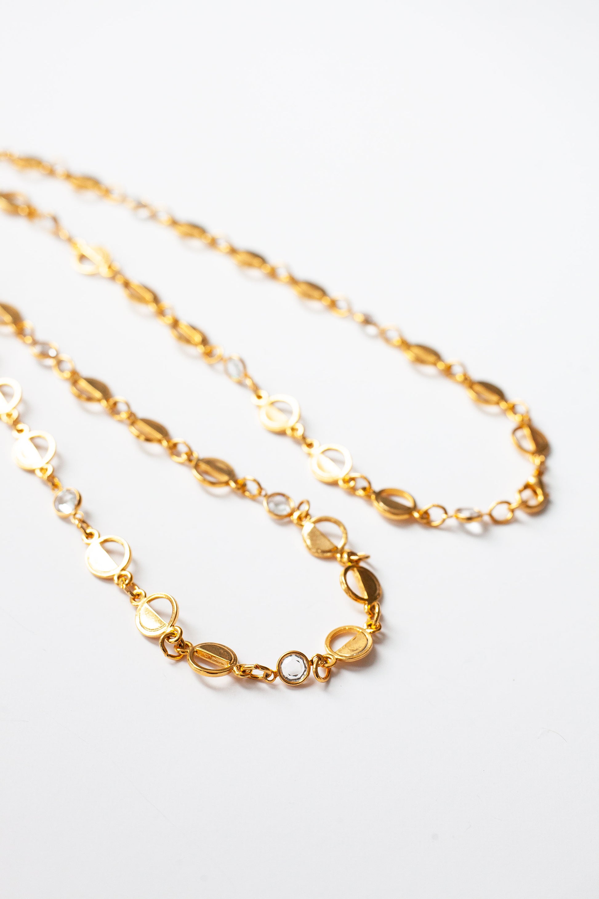 This vintage deadstock necklace features a long alternating chain design adorned with crystal bezel settings. Sourced in London, England.