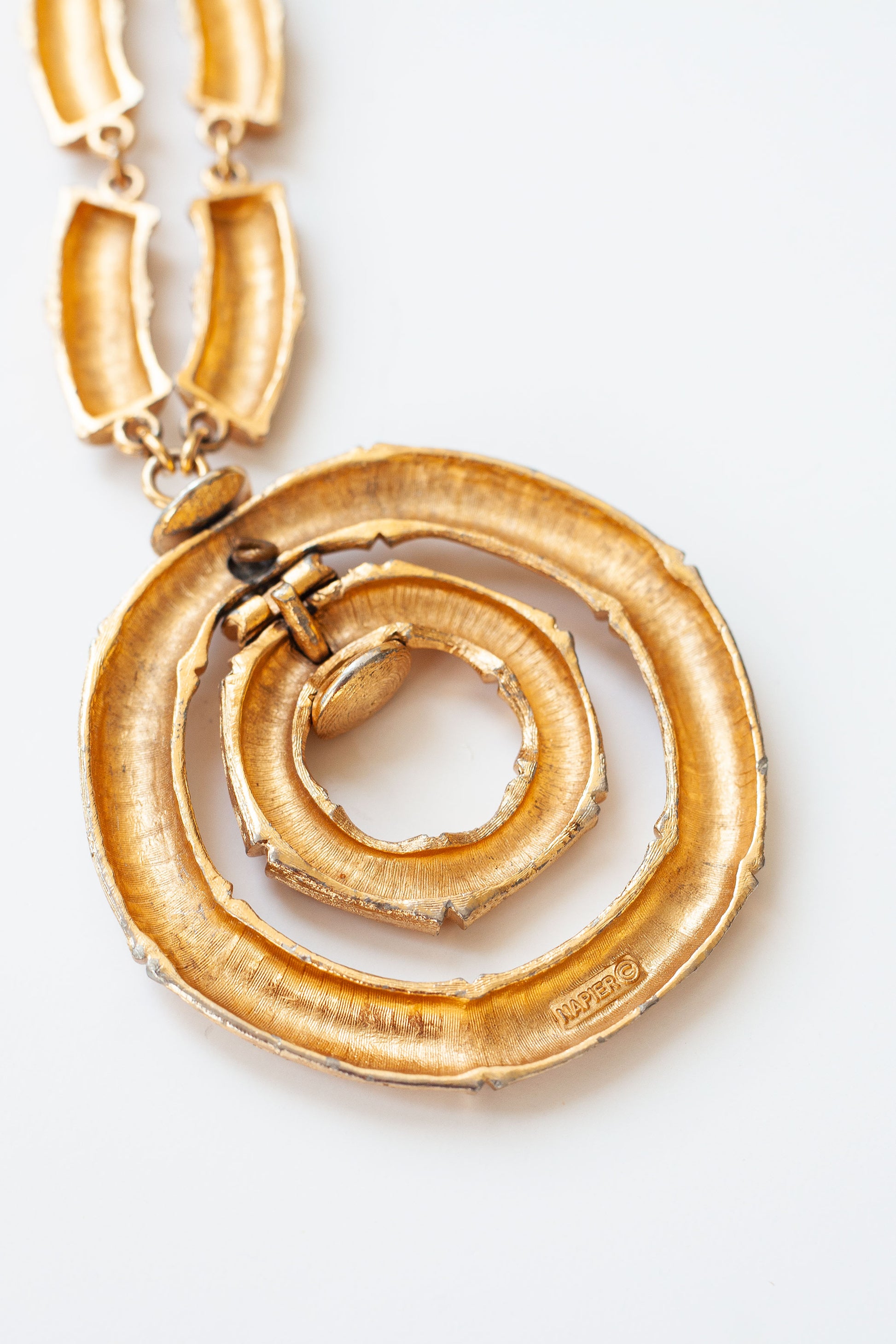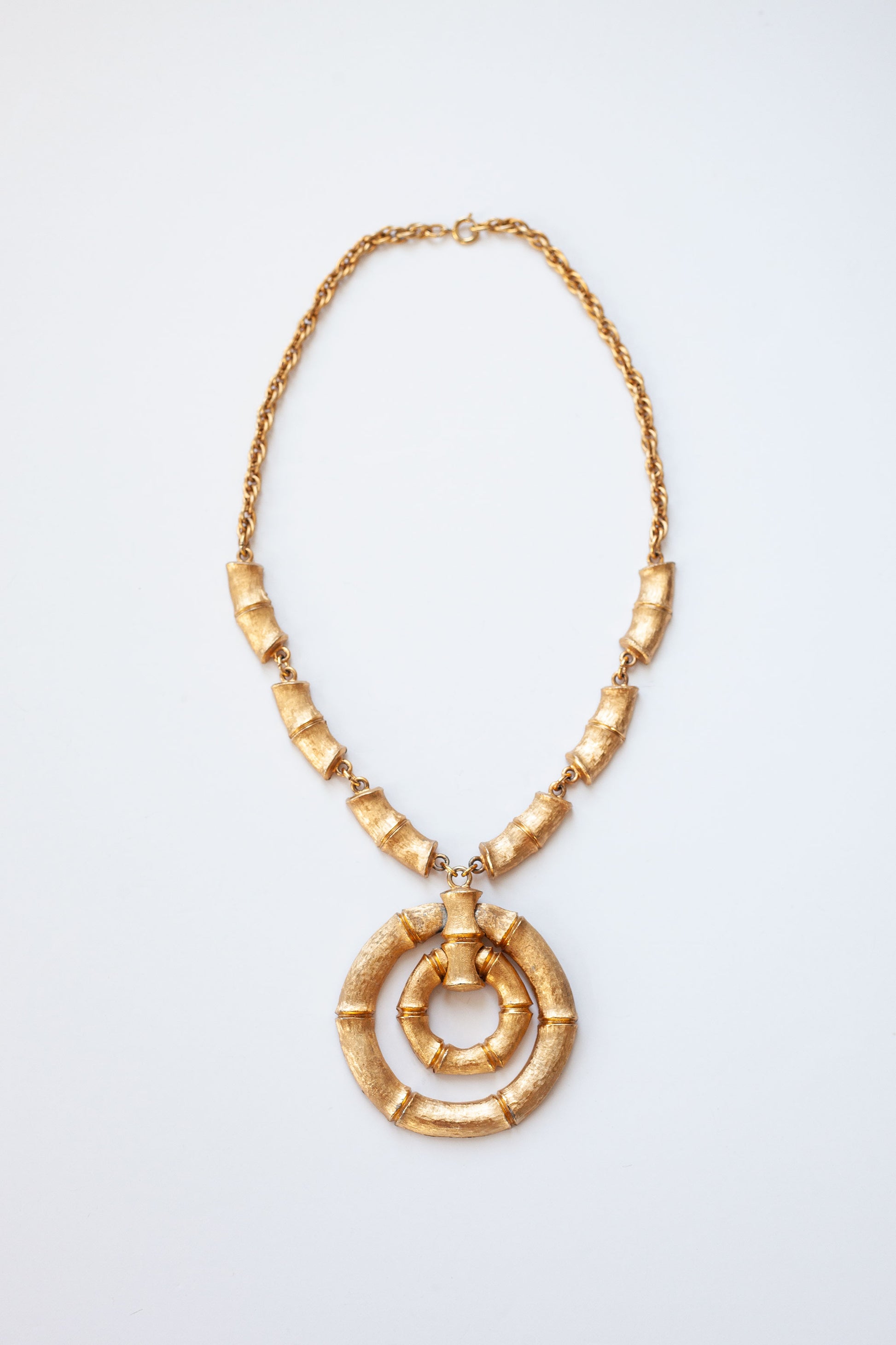 Vintage signed Napier 1960's bamboo-style long brushed and textured gold pendant necklace.