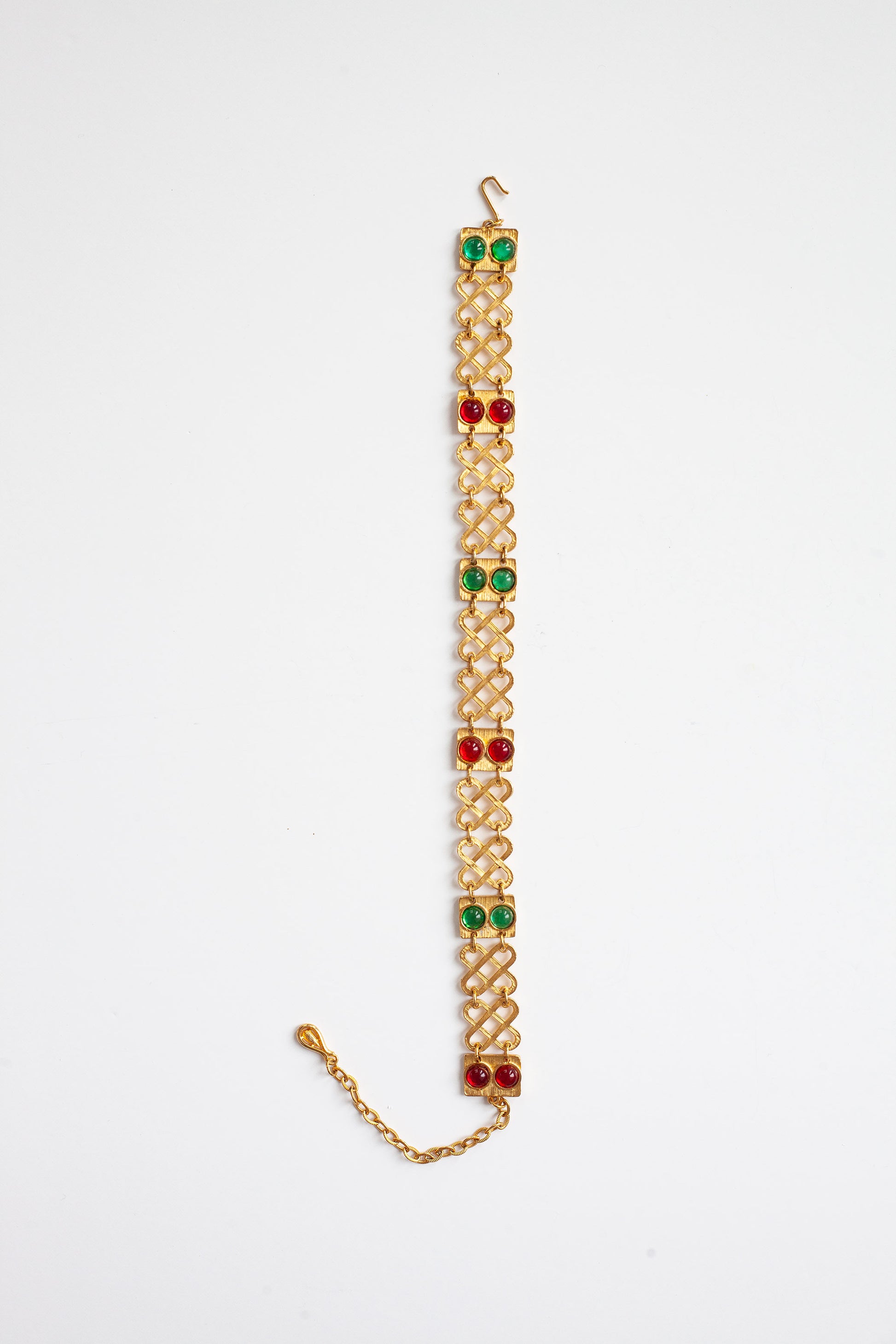 This vintage 1980's Coro choker features vibrant green and red cabochons set in a refined choker silhouette.