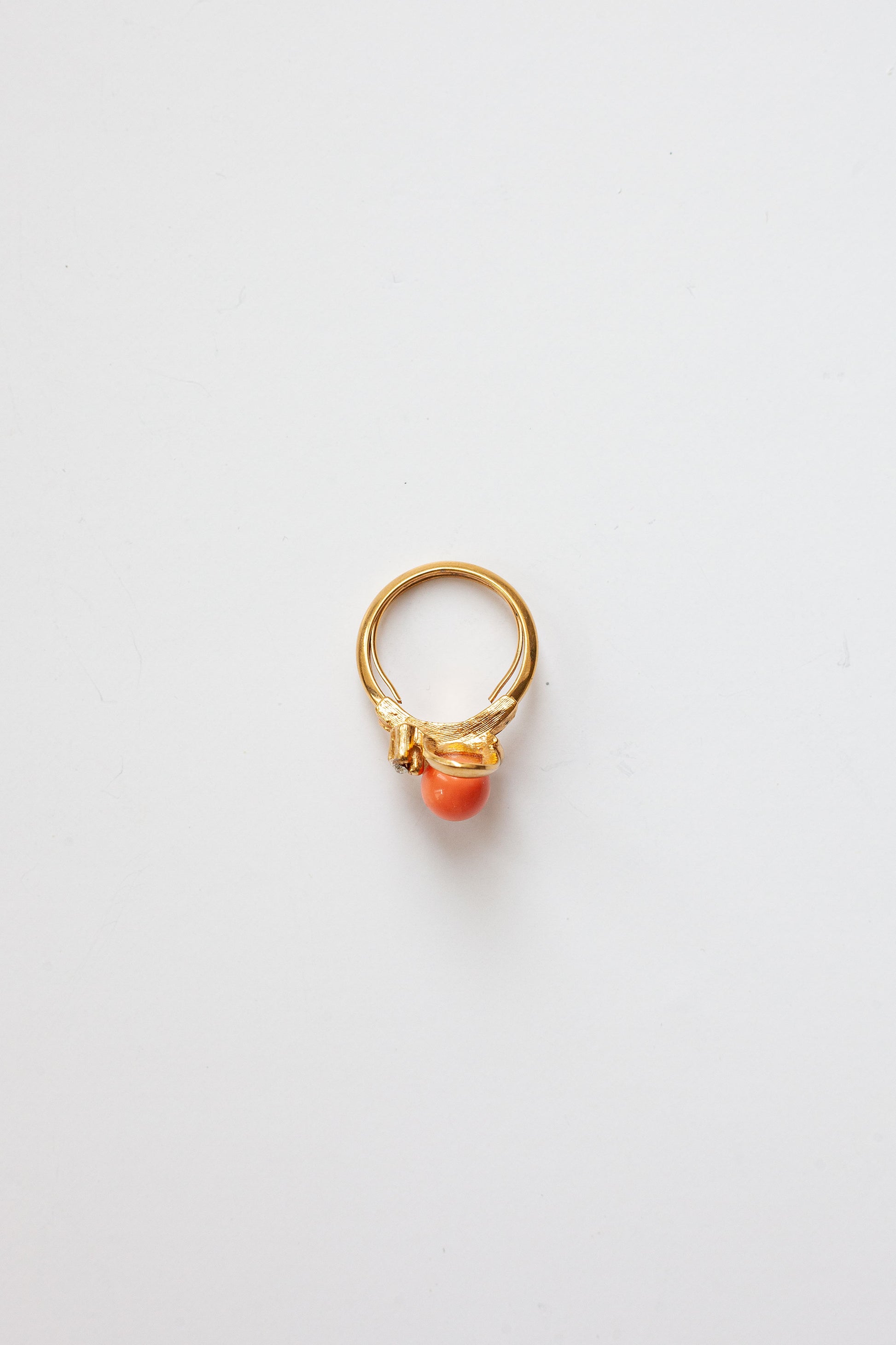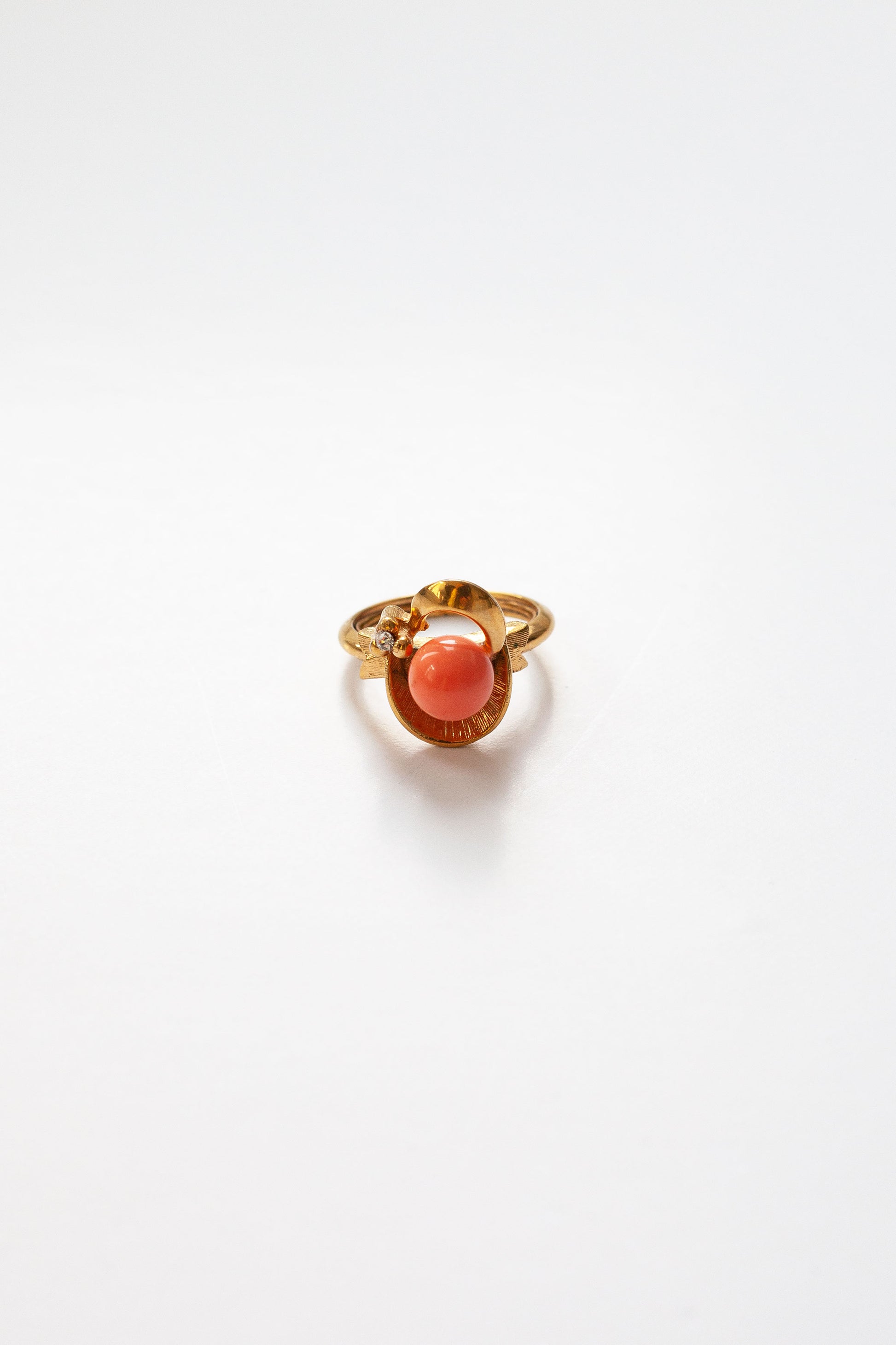 This adjustable vintage AVON cocktail ring features a coral-colored acrylic bead and sparkling rhinestone.
