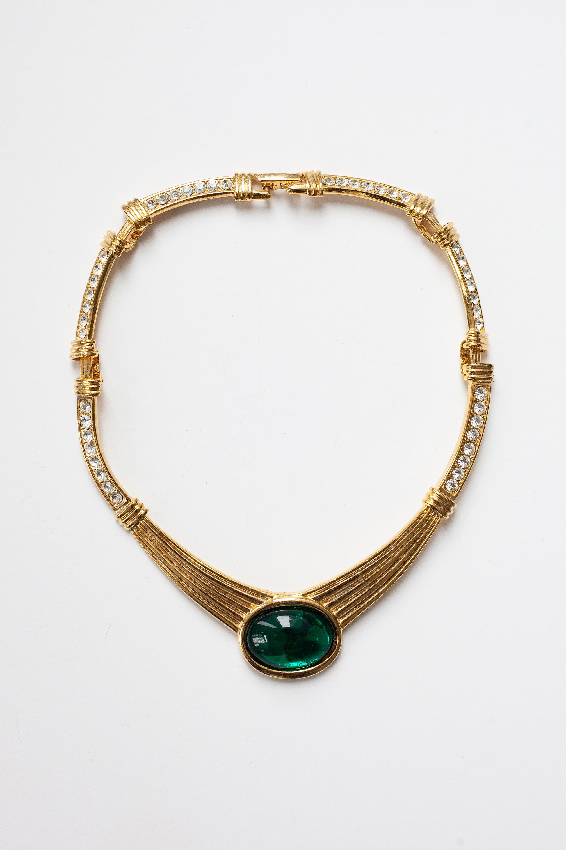 This vintage deadstock necklace from the 1980s features a prominent green cabochon centerpiece adorned with sparkling diamanté accents. Sourced in London, England.