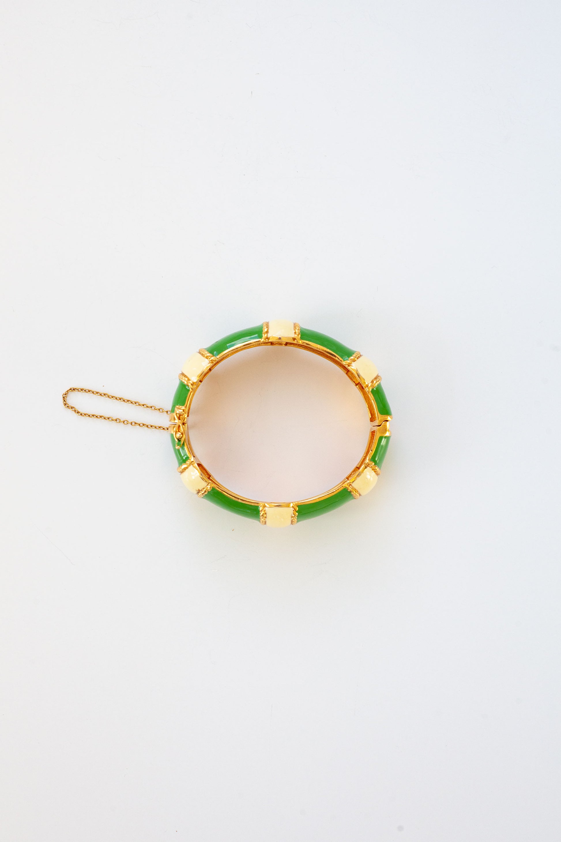 A beautiful hinged bangle bracelet with green and green enamel, safety chain and lock.