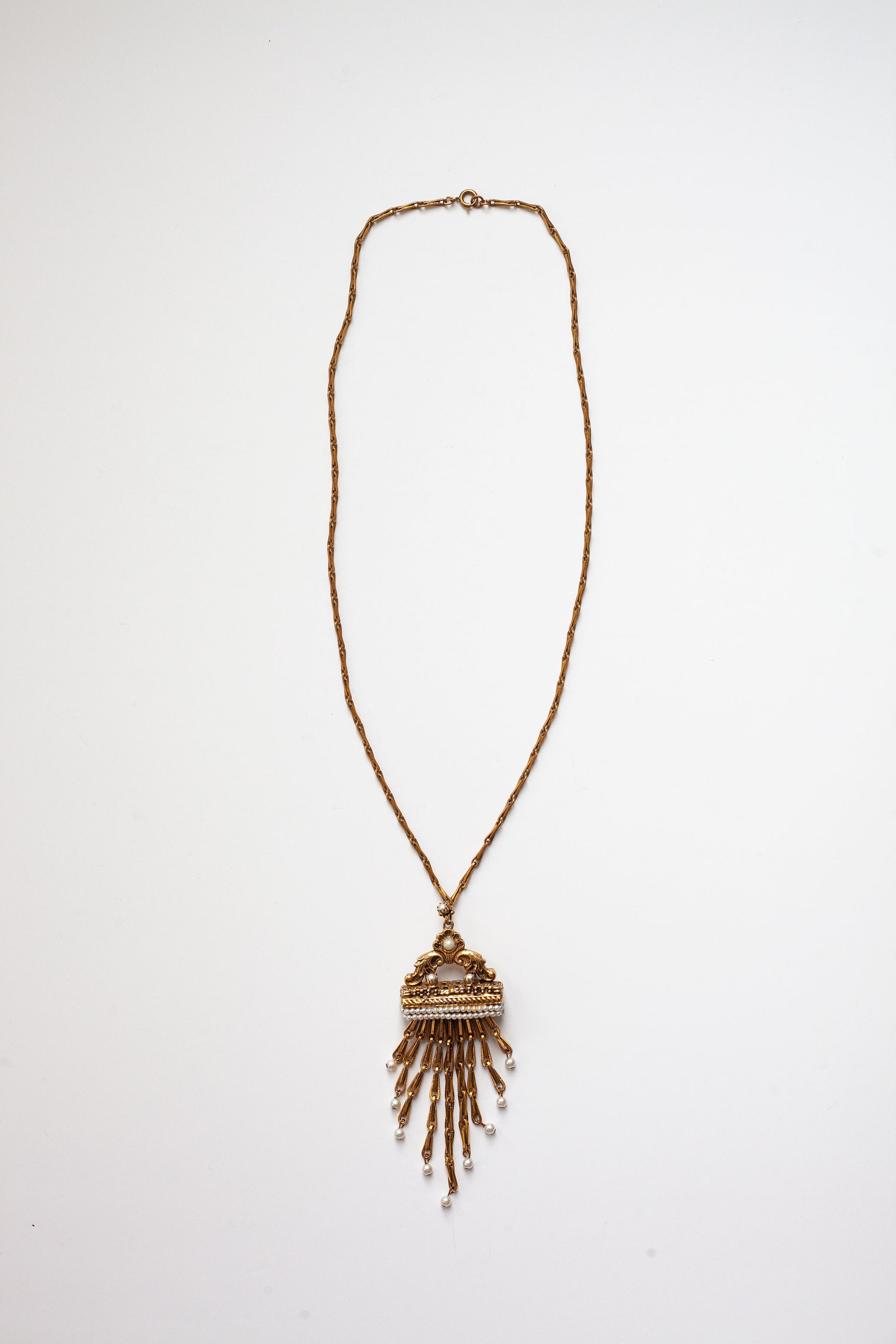 Beautiful vintage 1940s Etruscan-inspired necklace featuring pearls and an intricately crafted chain.