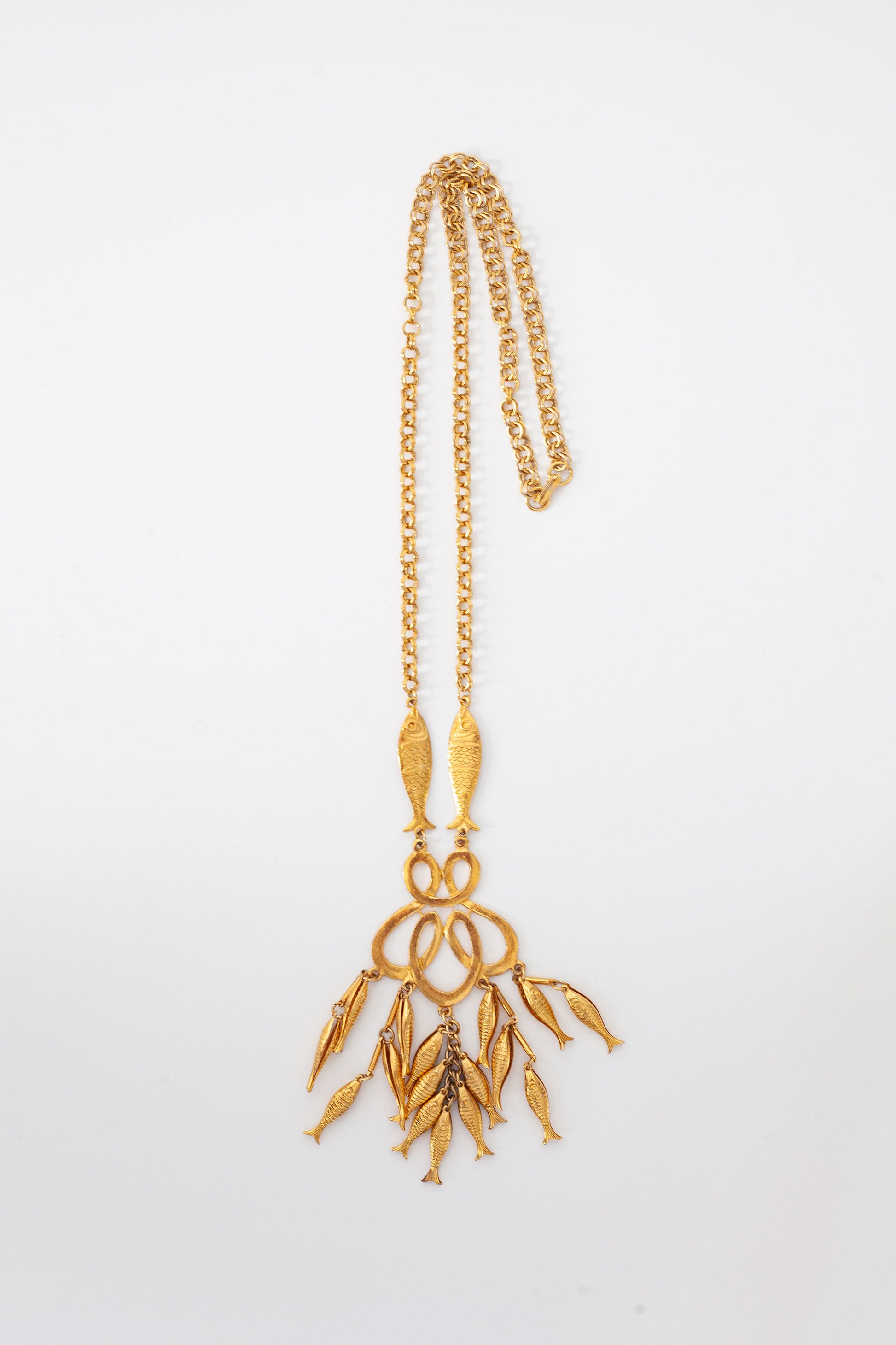 Unique long vintage dangle necklace with multiple fish charms on a double link chain.