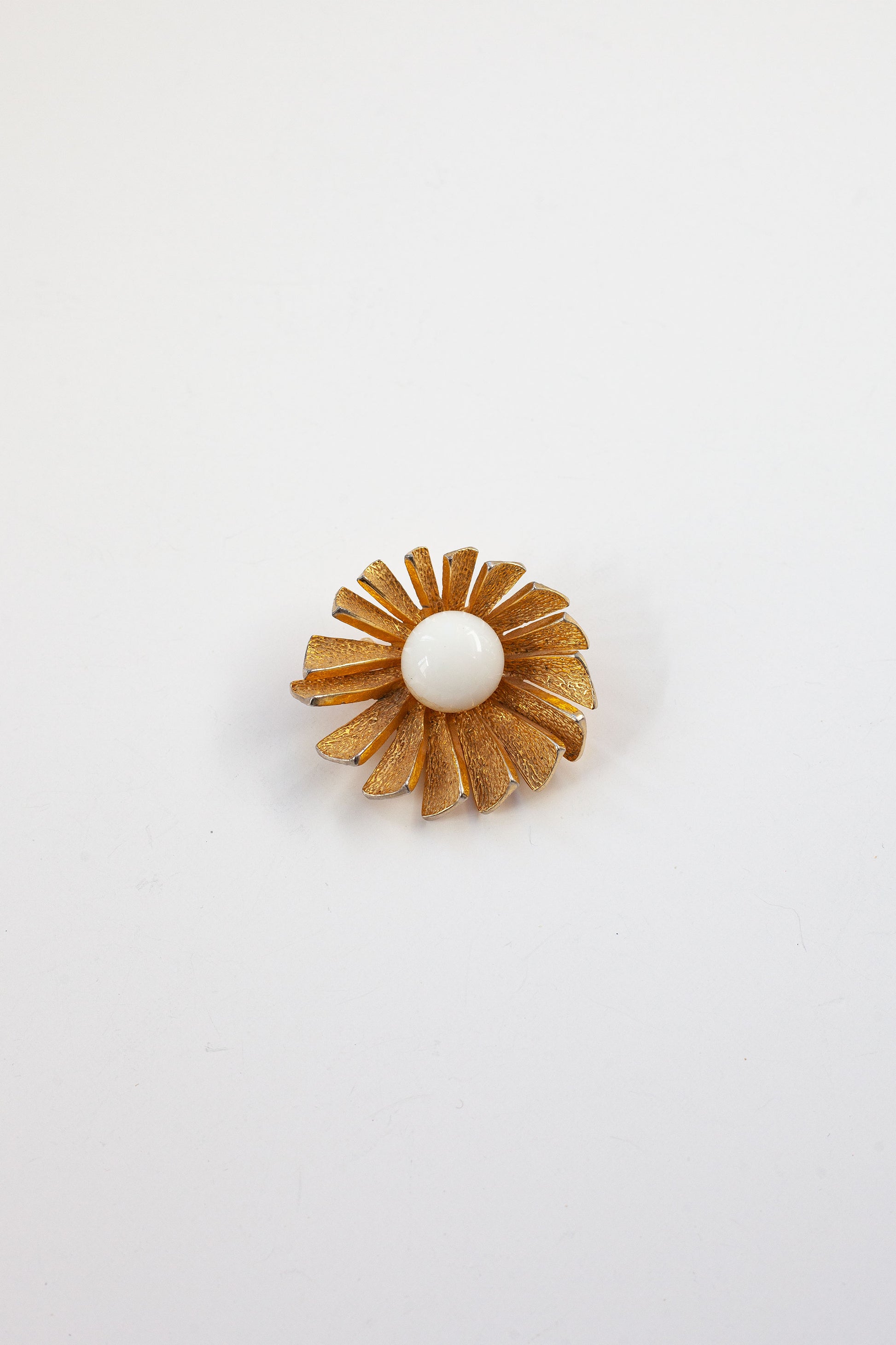 A beautiful Castlecliff brooch featuring a floral design, anchored by a white glass bead at its center.