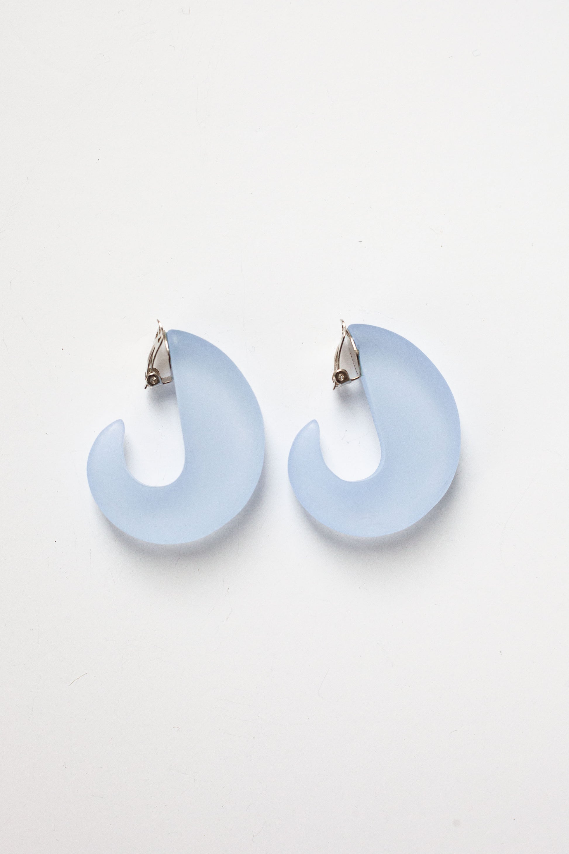 These vintage deadstock earrings feature a frosted pastel blue lucite design, offering a fresh and playful look. Made in Paris, France, they capture the vibrant style and quality of their origin. Two pairs available. Sourced in London, England.