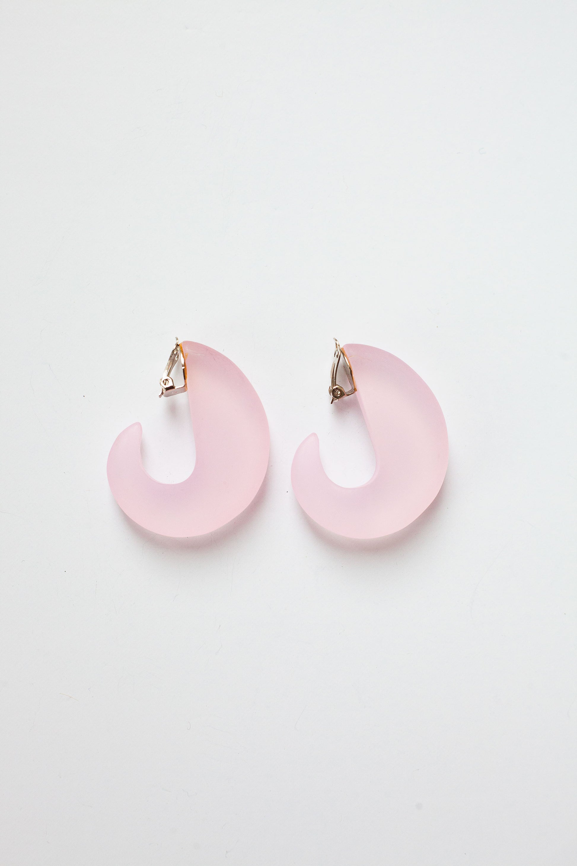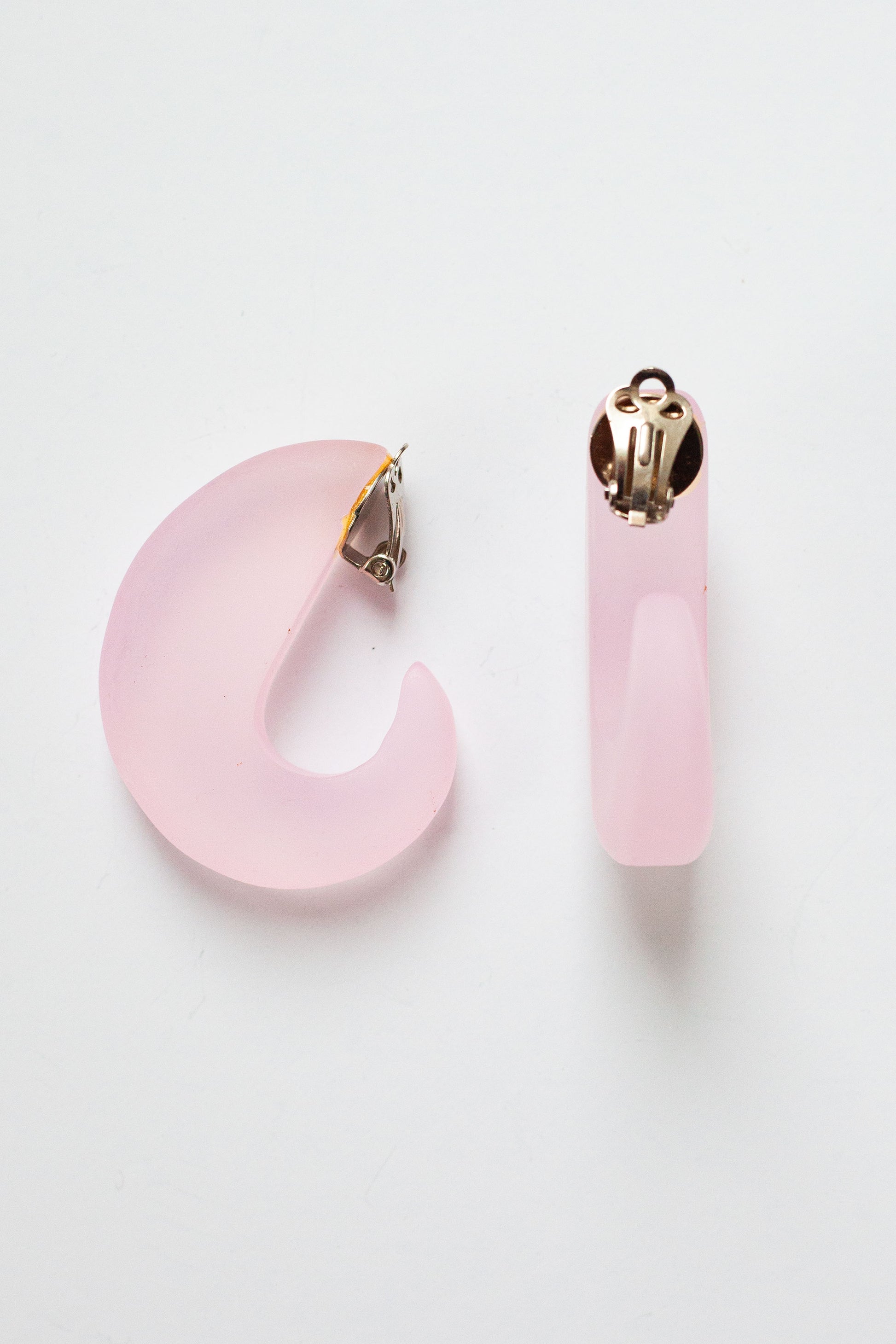 These vintage deadstock earrings feature a frosted pastel pink lucite design, offering a fresh and playful look. Made in Paris, France, they capture the vibrant style and quality of their origin. Sourced in London, England.