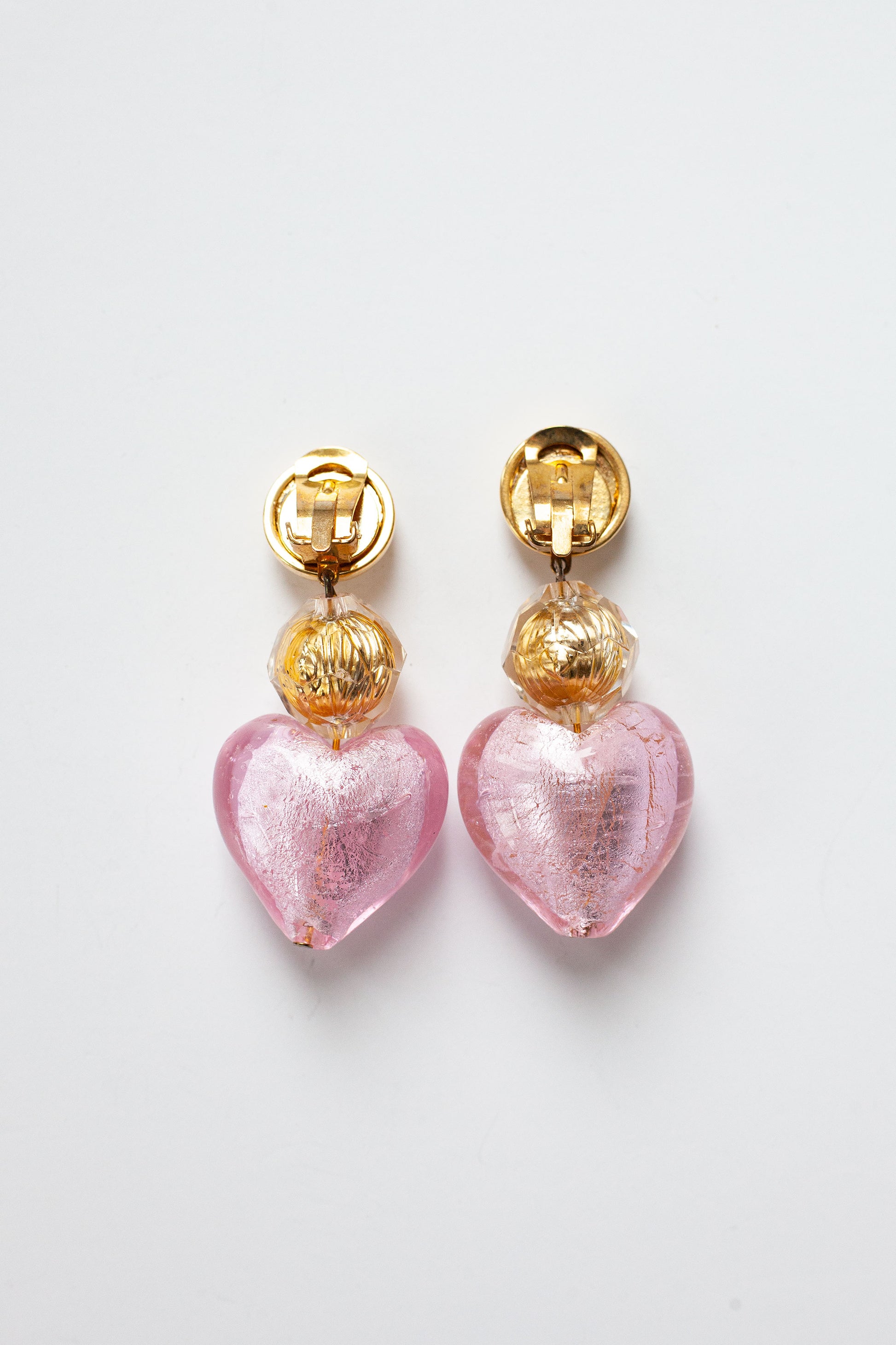 These vintage deadstock glass heart drop earrings are by Marion Godart, a Parisian designer acclaimed since 1988 for her distinctive and stylish costume jewelry. Although unsigned, her pieces are easily identifiable by their unique and playful aesthetic. Crafted in France, these earrings exemplify her quirky design signature. Sourced in London, England.