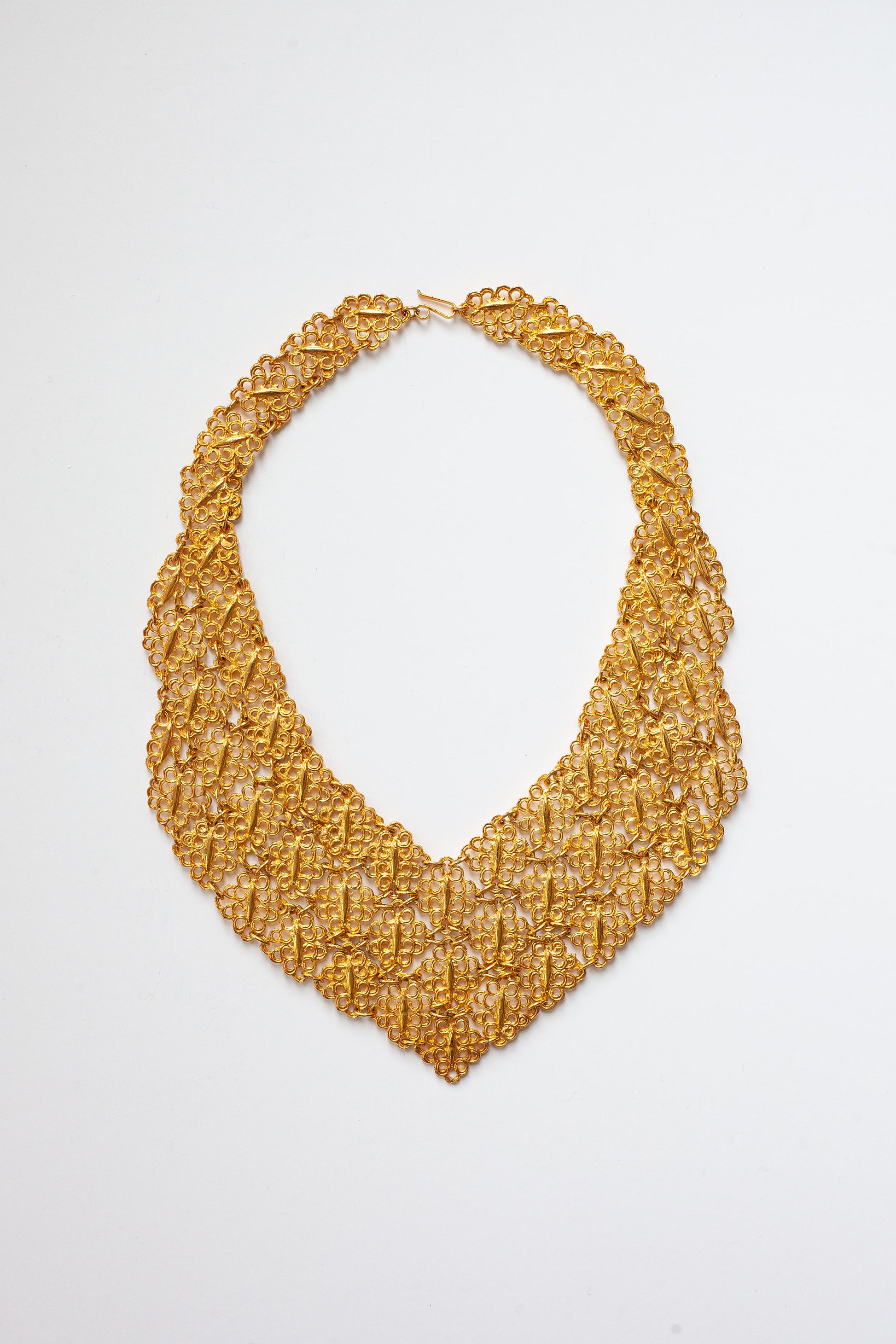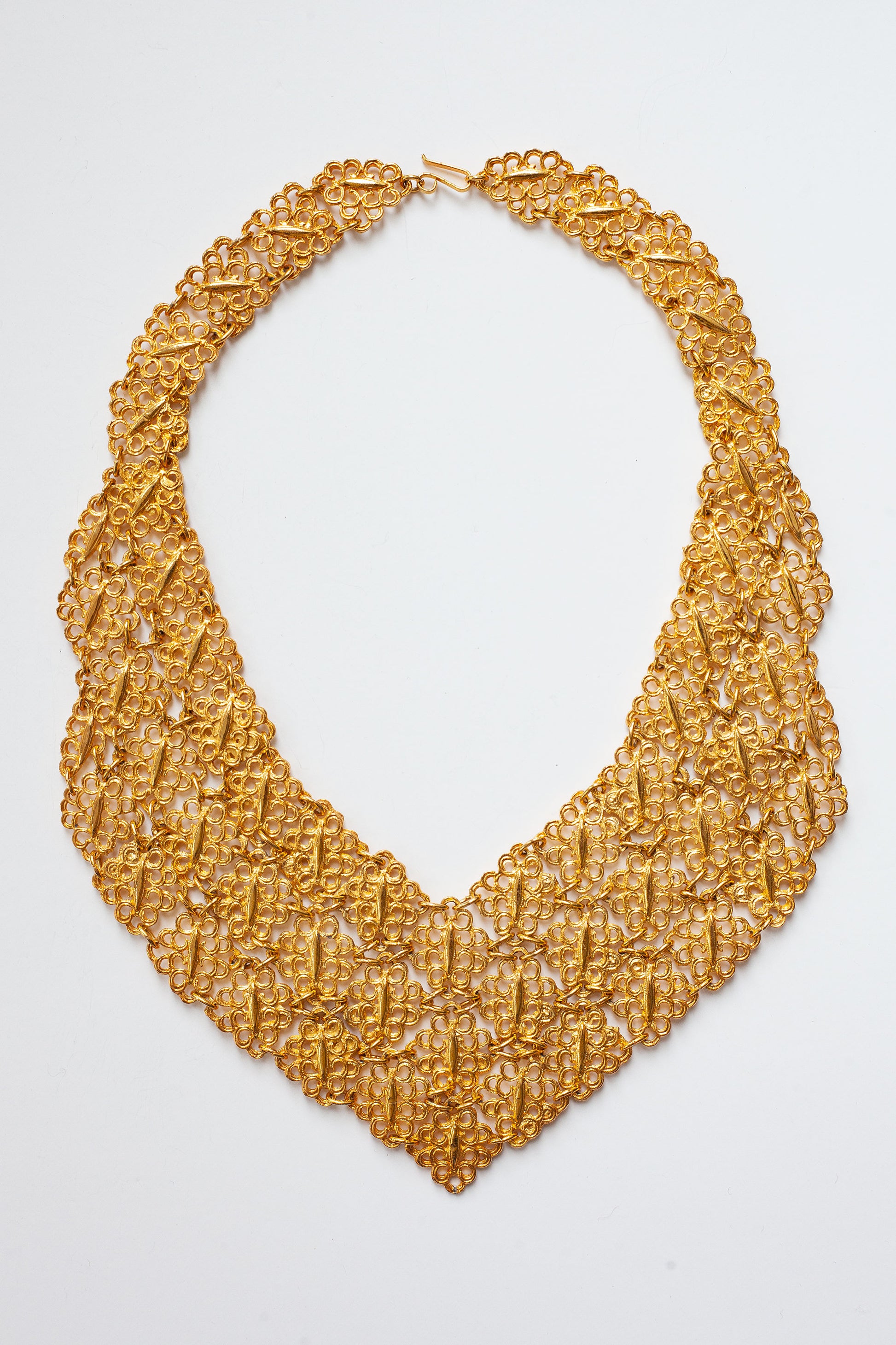 An exquisite vintage bib necklace from D'Orlan featuring detailed craftsmanship and secured with a hook and eye clasp, perfect for making a refined statement.