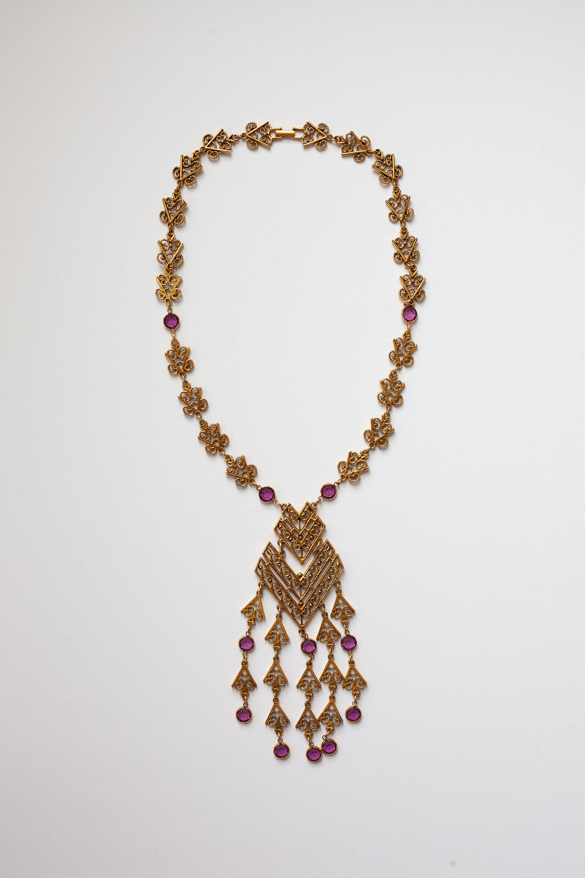 Elegant long vintage chain featuring intricate detailing and crystal bezel accents. Unsigned, but attributed to Goldette.