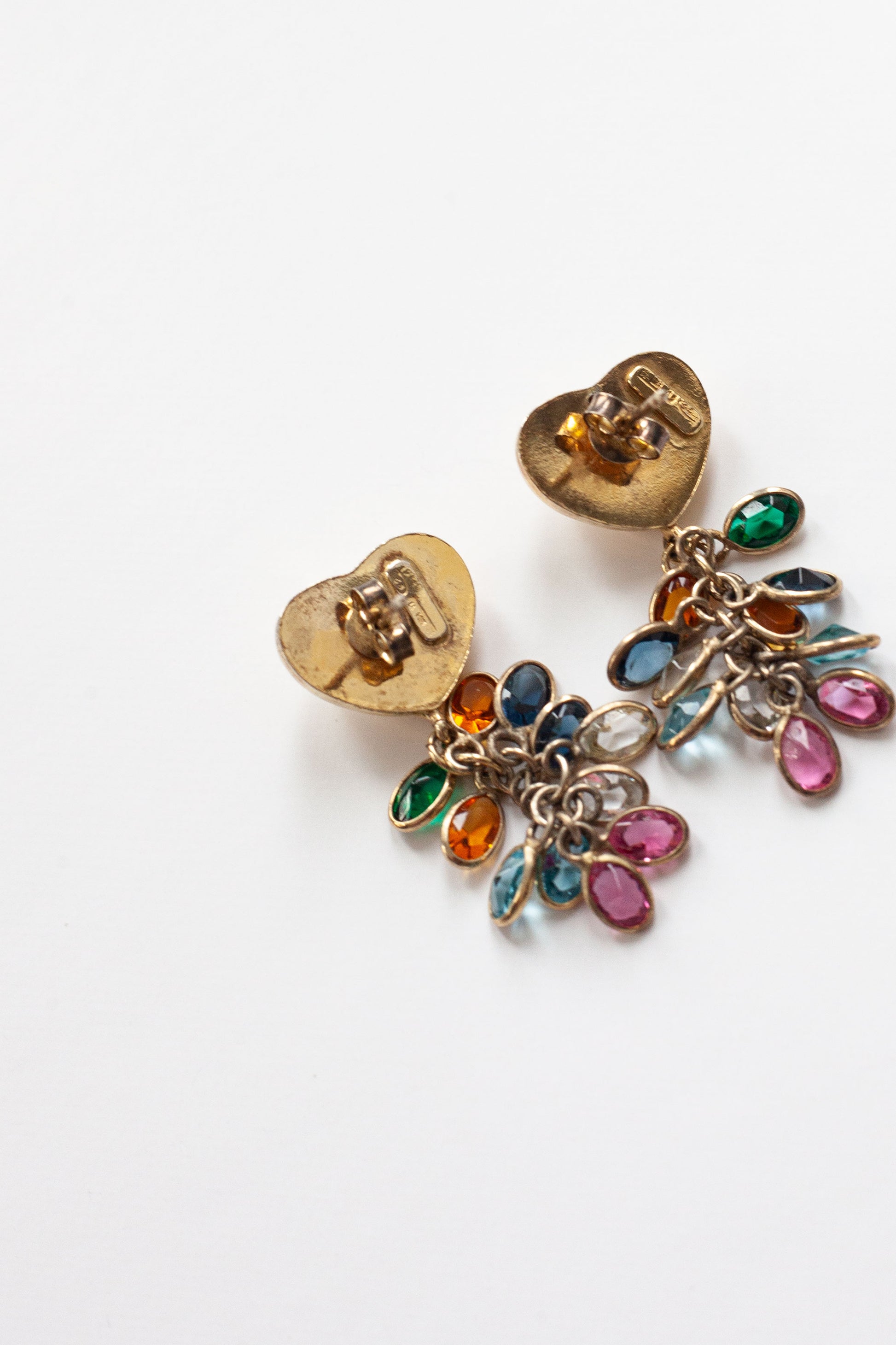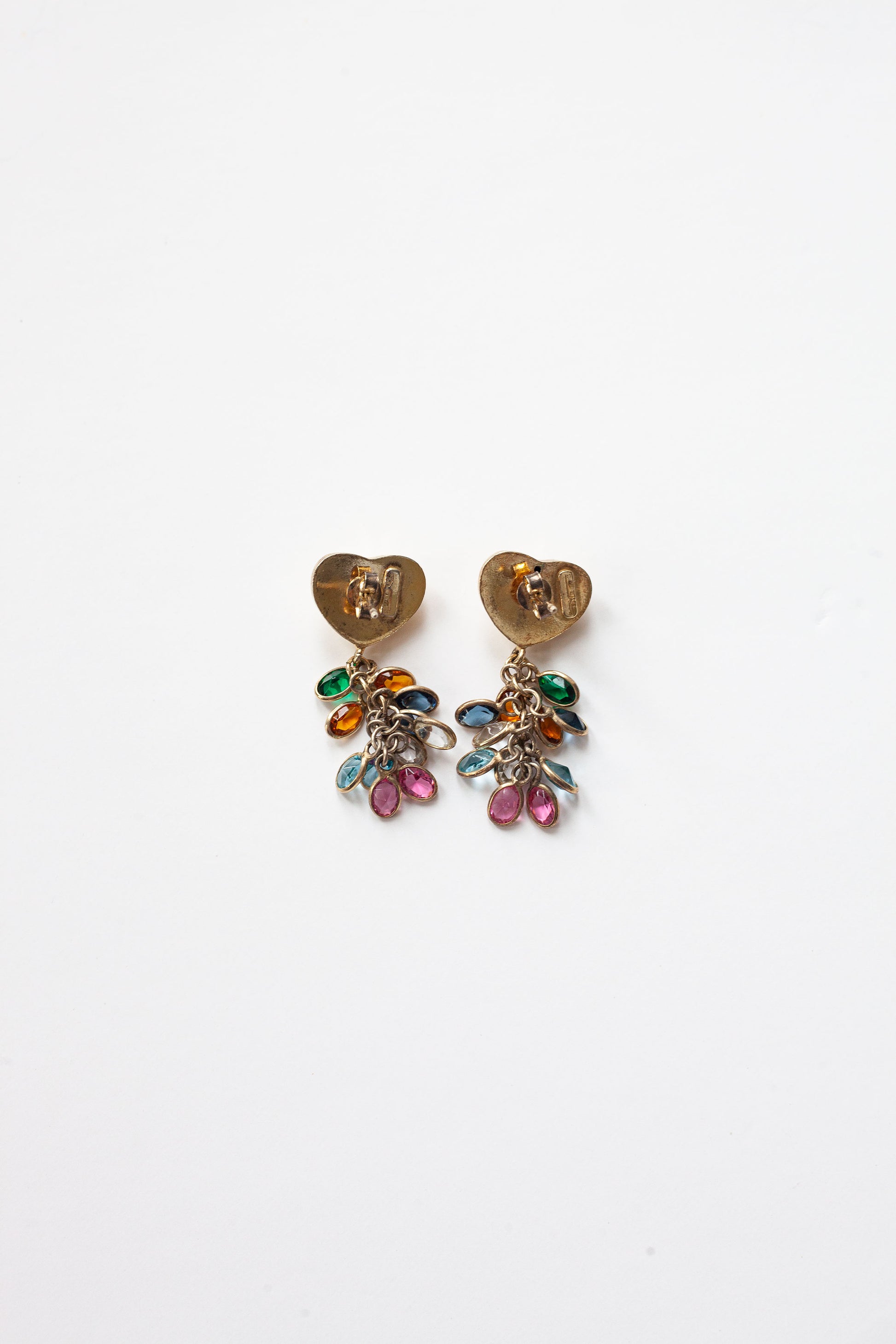 Delicate Italian gold plated silver heart-shaped vintage drops adorned with multi-colour faceted crystals.