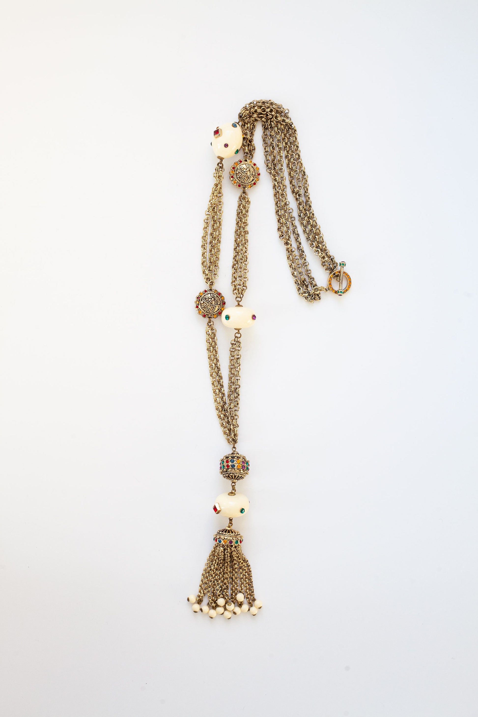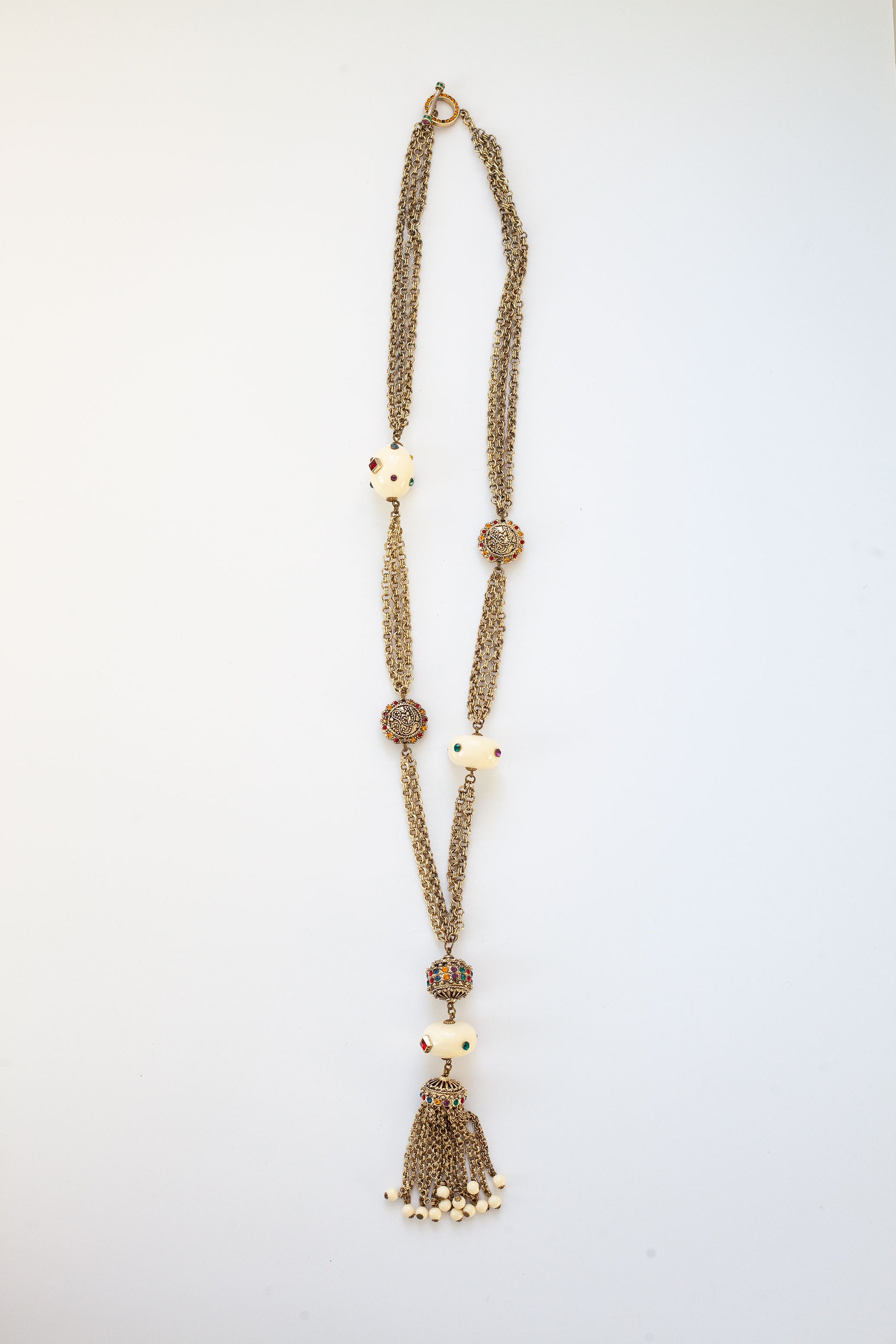 This extra long vintage necklace by Heidi Daus presents a sophisticated multi-strand design in warm gold-tone finish, adorned with cream-colored stones and vibrant multi-hued rhinestones, and a chain tassel pendant.
