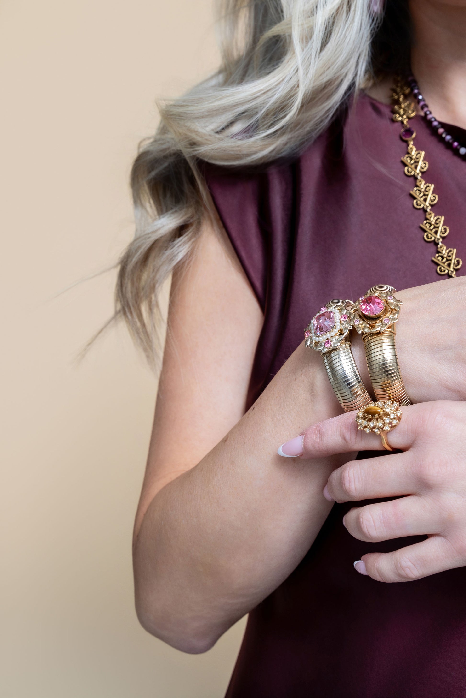 Vintage signed Coro Pegasus stretch omega bracelet with pink rhinestones and pearls. Circa 1940's.