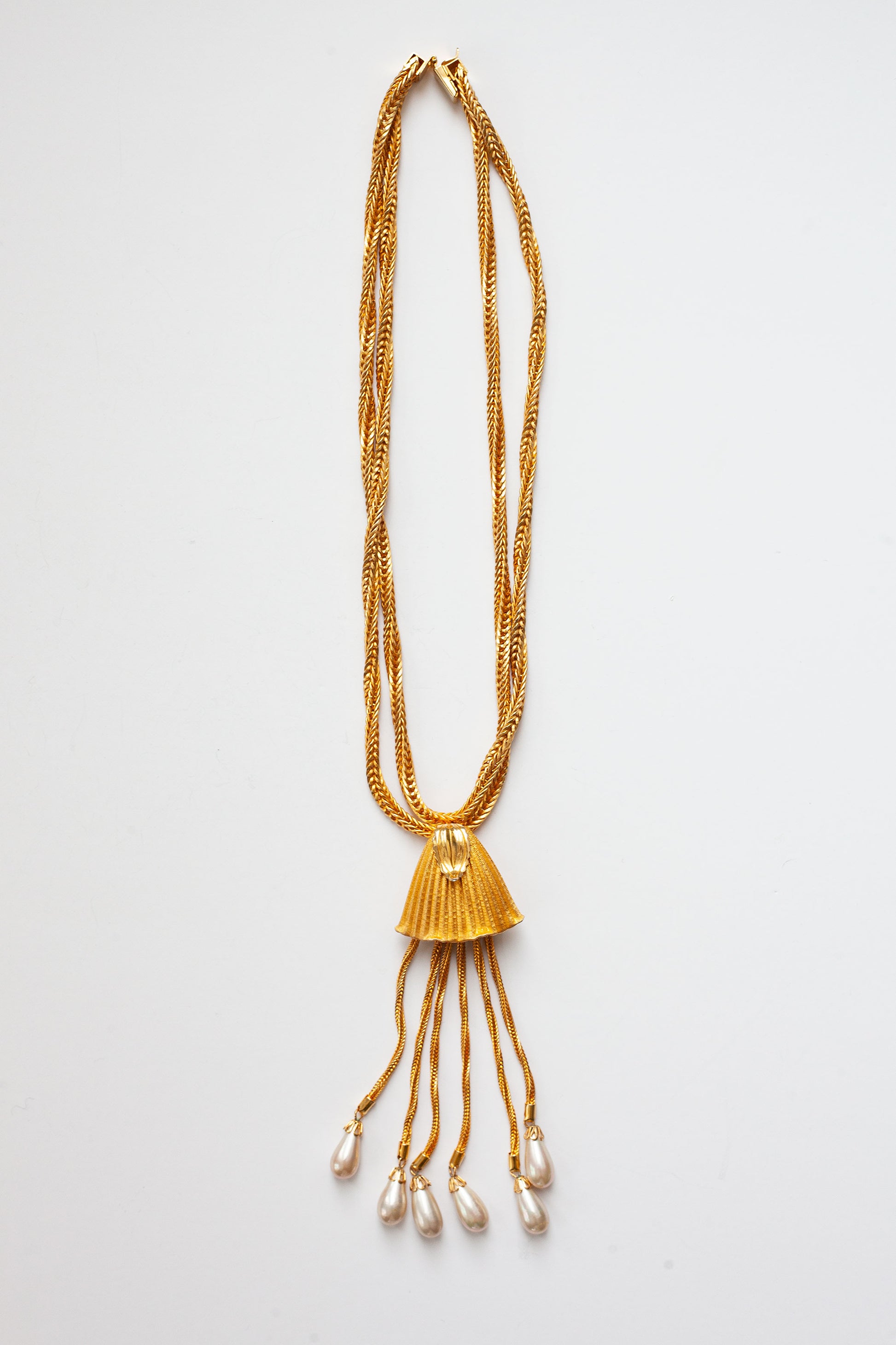 A perfectly on-trend vintage tassel necklace with faux pearl and chain dangles.