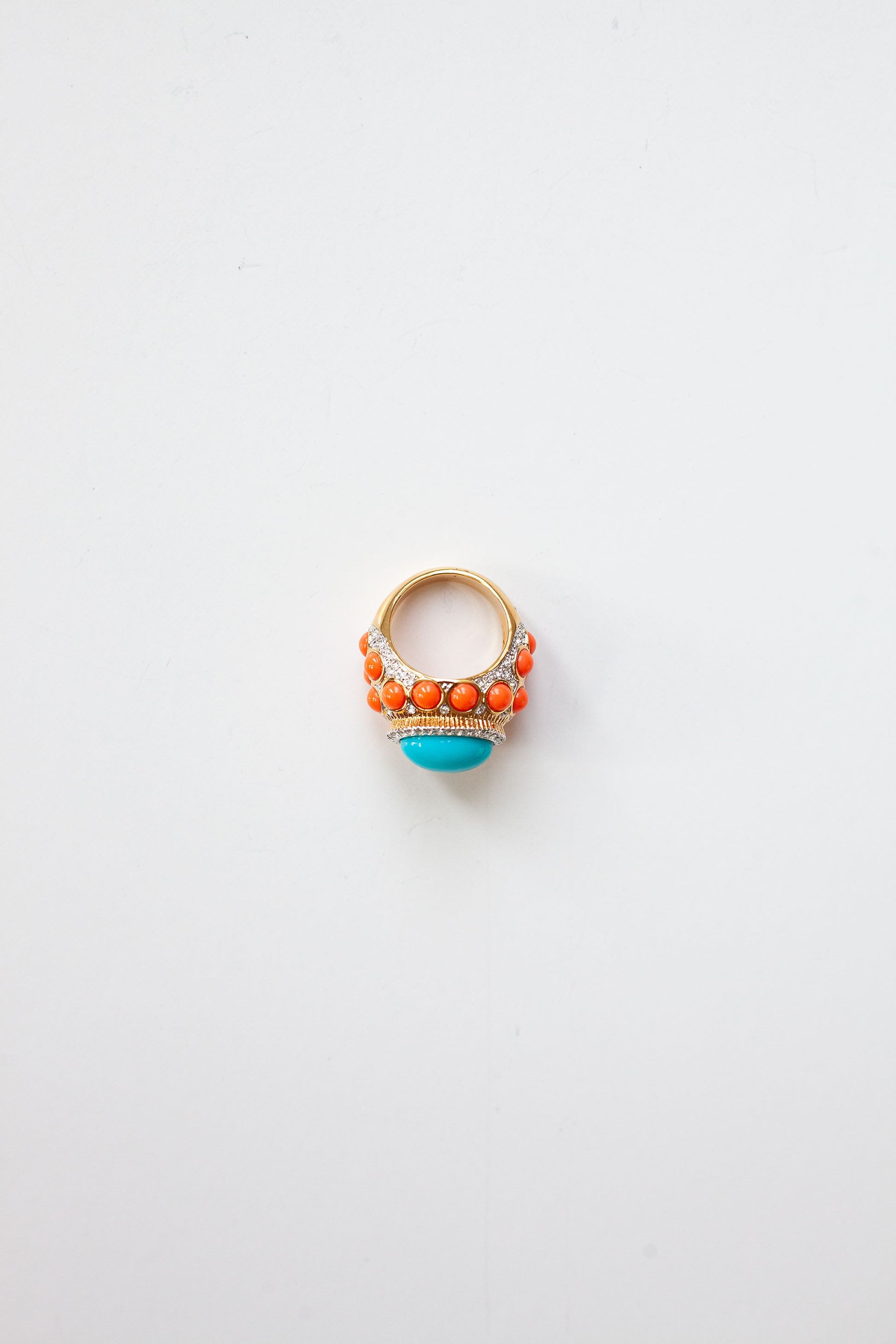 A distinguished cocktail ring featuring the iconic KJL design aesthetic, showcasing vibrant coral and turquoise cabochon stones.