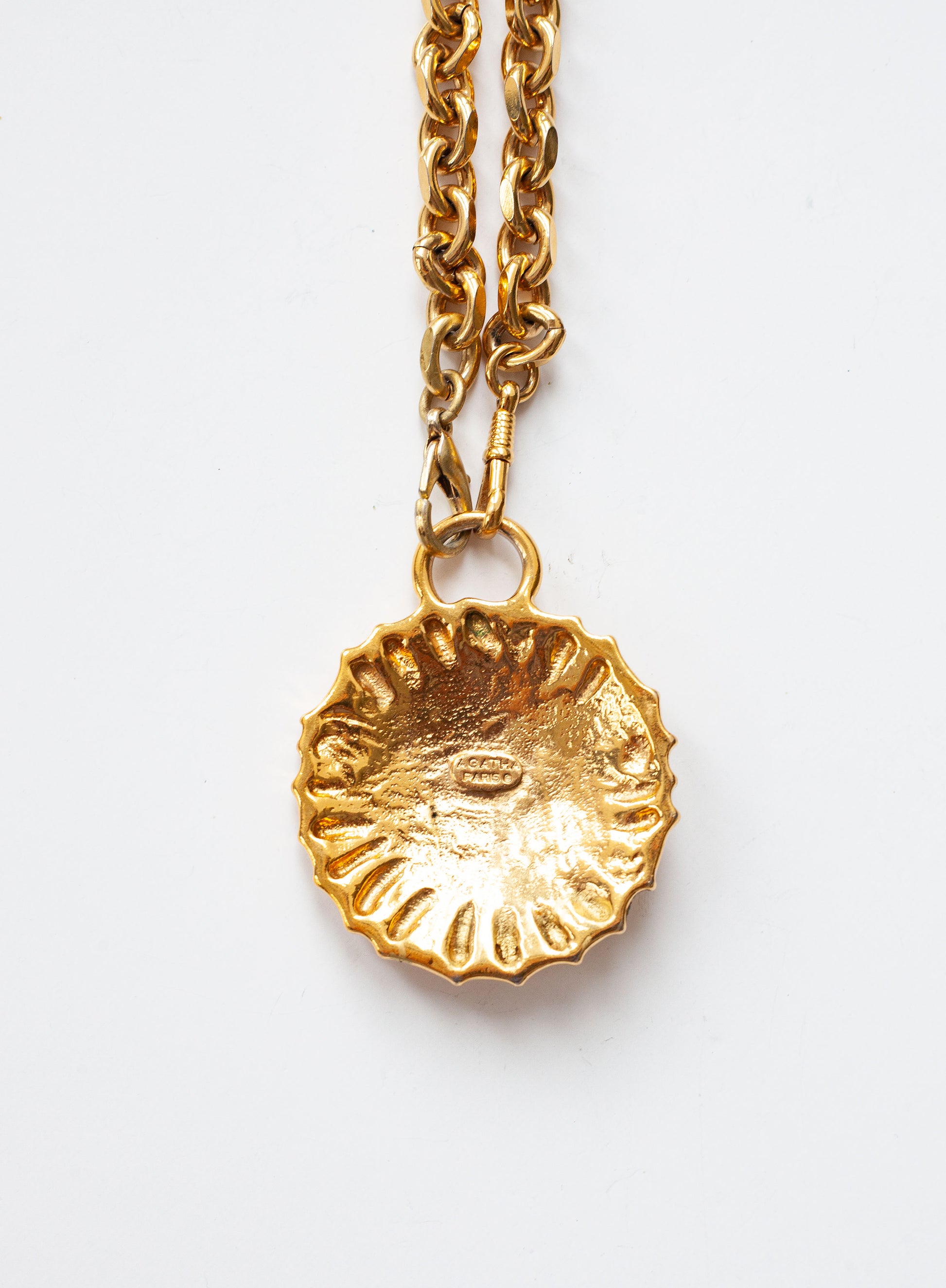 Vintage 1980's Agatha Paris vintage necklace with a heavy weight chain and commanding sun medallion.