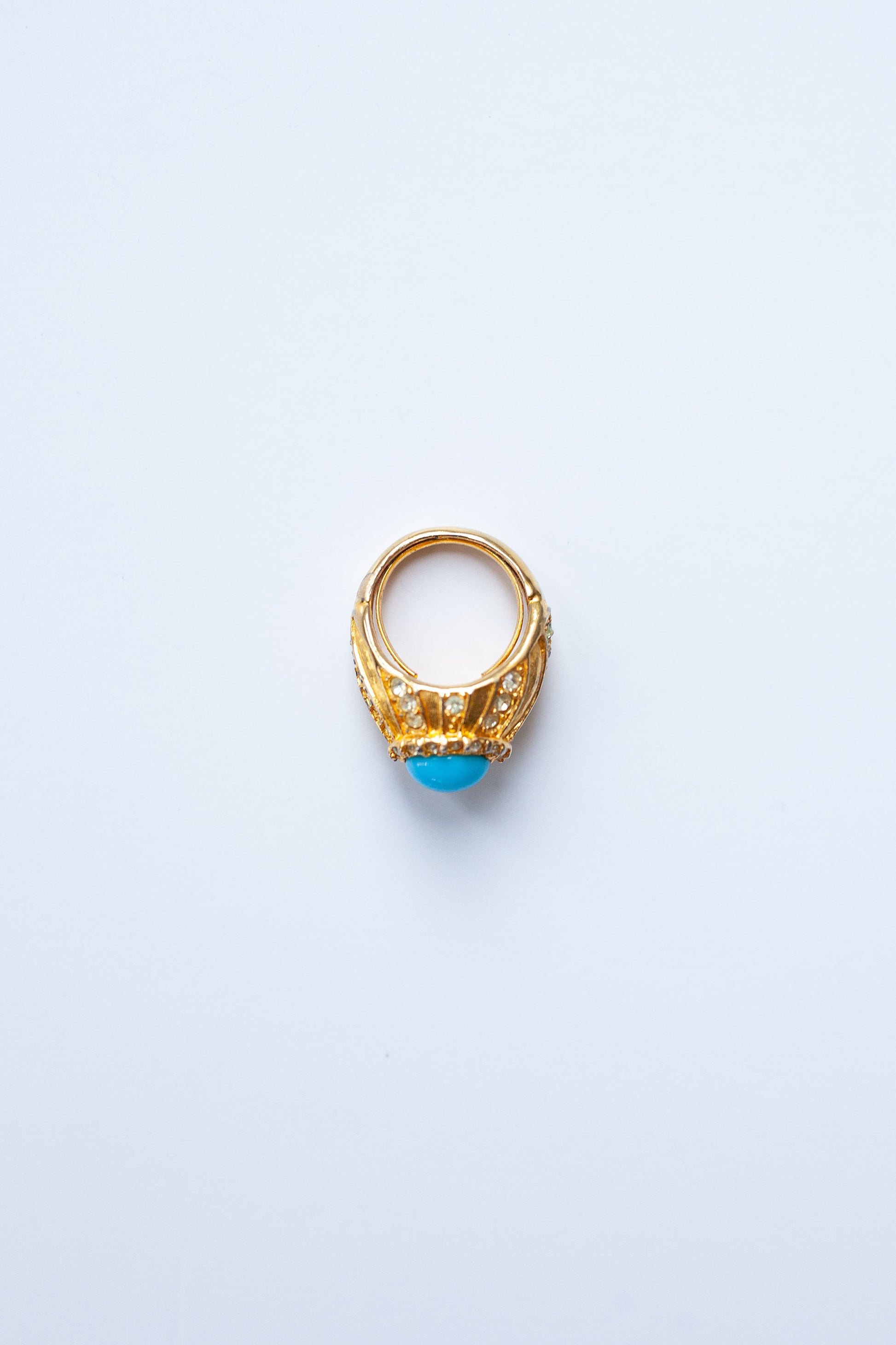 An incredibly detailed vintage cocktail ring with a glass turquoise-colour stone and rhinestones throughout. Adjustable size.