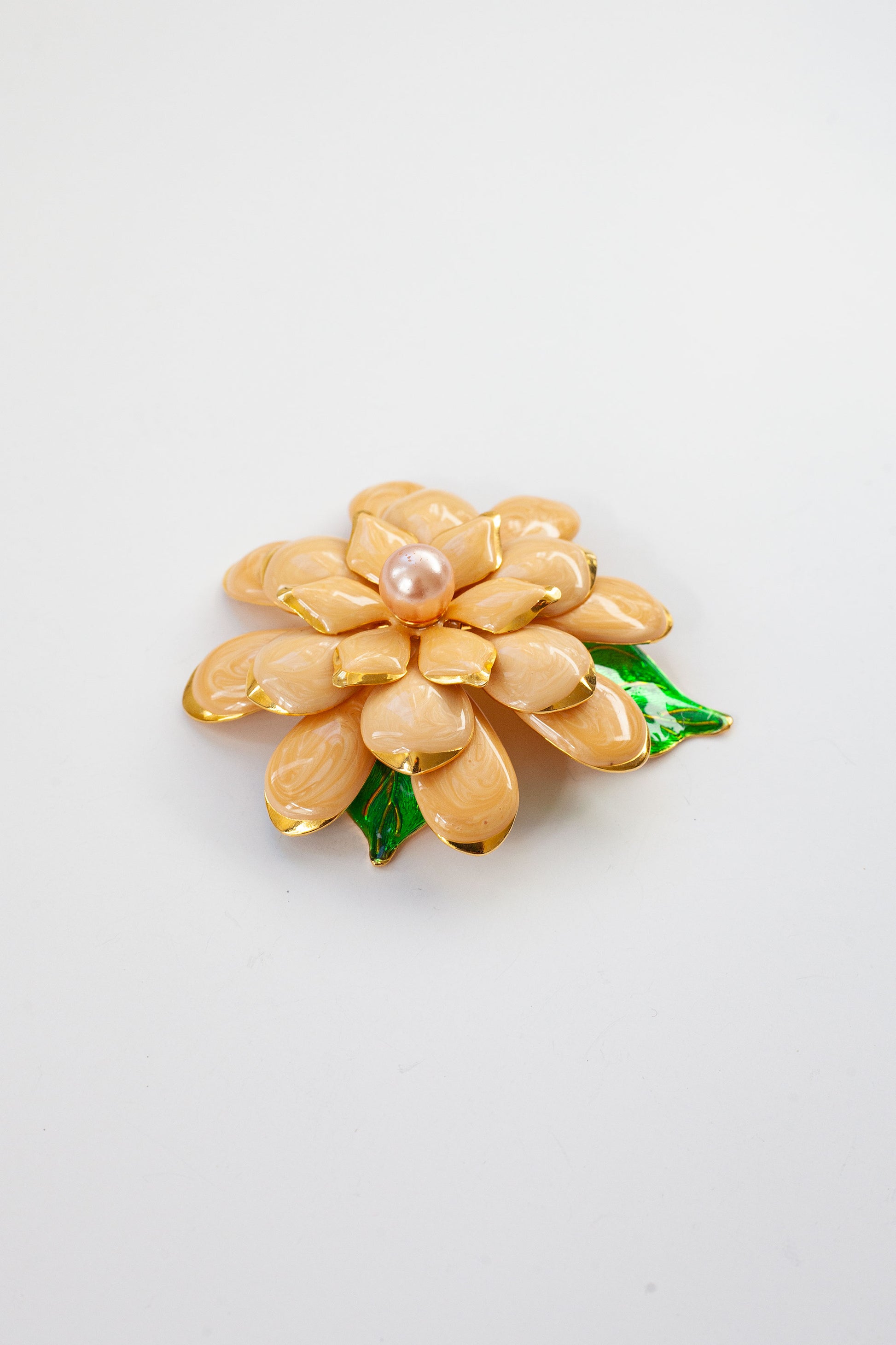 Vintage Joan Rivers brooch featuring an oversized floral silhouette in warm gold with a faux pearl centerpiece in soft peach hues. A signature piece from the designer's celebrated costume jewelry collection, it demonstrates the bold aesthetic and meticulous construction that defined her iconic brand.